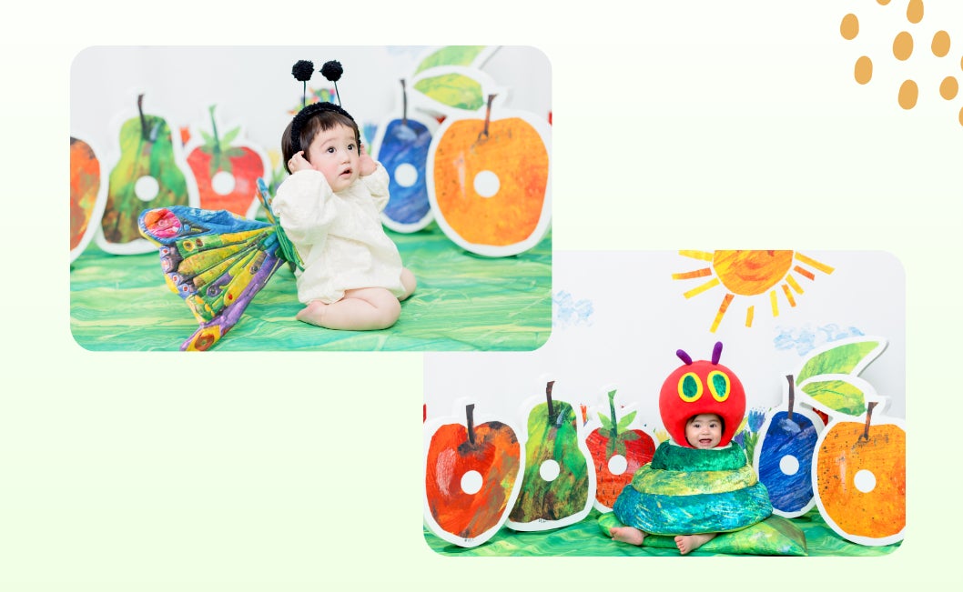 背景には「おひさま」や「チューリップ」などの絵本モチーフ、プロップ(撮影小物)には物語に登場する果物を忠実に再現。まるで絵本の1ページに入り込んだような世界観で撮影をお楽しみいただけます。
