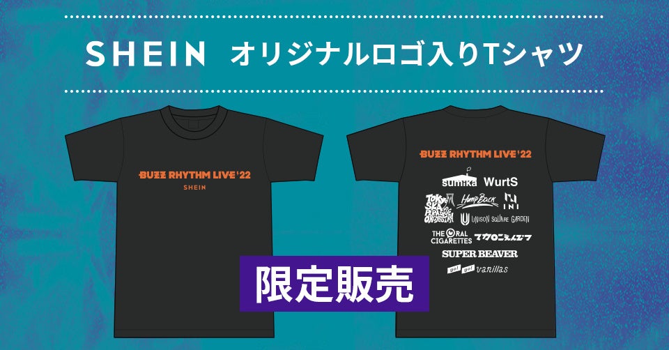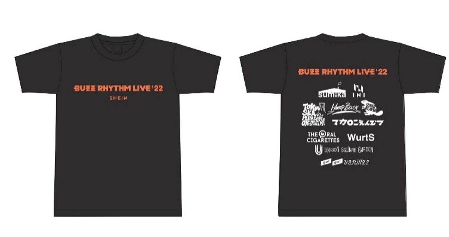 そして、今回は「SHEIN」がデザインしたTシャツ付きチケットも販売いたします。Tシャツは、「BUZZ RHYTHM LIVE 22 SHEIN」のロゴを両面に、出演アーティストのロゴは背面に配置しております。デザインは、ブラック地にオレンジ文字とホワイト文字で落ち着いた秋らしさとライブイベントに合わせたポップなデザインとなっております。サイズ展開は、どなたにもご購入いただけるようS、M、L、XLの4種類をご用意しております。