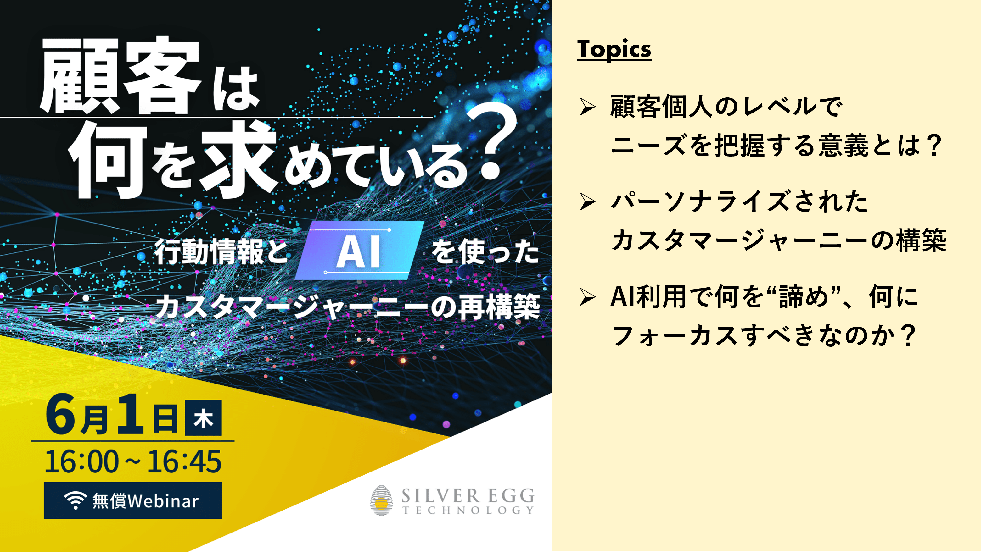 参加登録U R L: https://www.silveregg.co.jp/archives/event/2023-06-01-AI-Customer-Journey-webinar