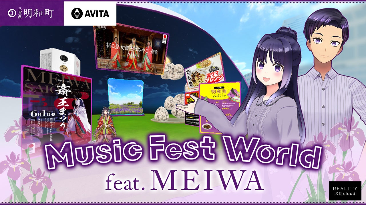 世界中で累計1億人の来場者数を突破したスマートフォン向けメタバース「REALITY」上で提供する「REALITY Worlds」にて、「Music Fest World feat. MEIWA」を期間限定でオープンいたします。本空間は、「REALITY Worlds」で人気のメタバース空間「ミュージックフェスワールド」を全面的にジャックし、AVITA開発の明和町オフィシャルアバターに名前をつけて応募する「三重県明和町アバターお名前募集!松阪牛プレゼント」キャンペーン実施のほか、明和町の魅力発信に向けた様々なコンテンツを提供いたします。