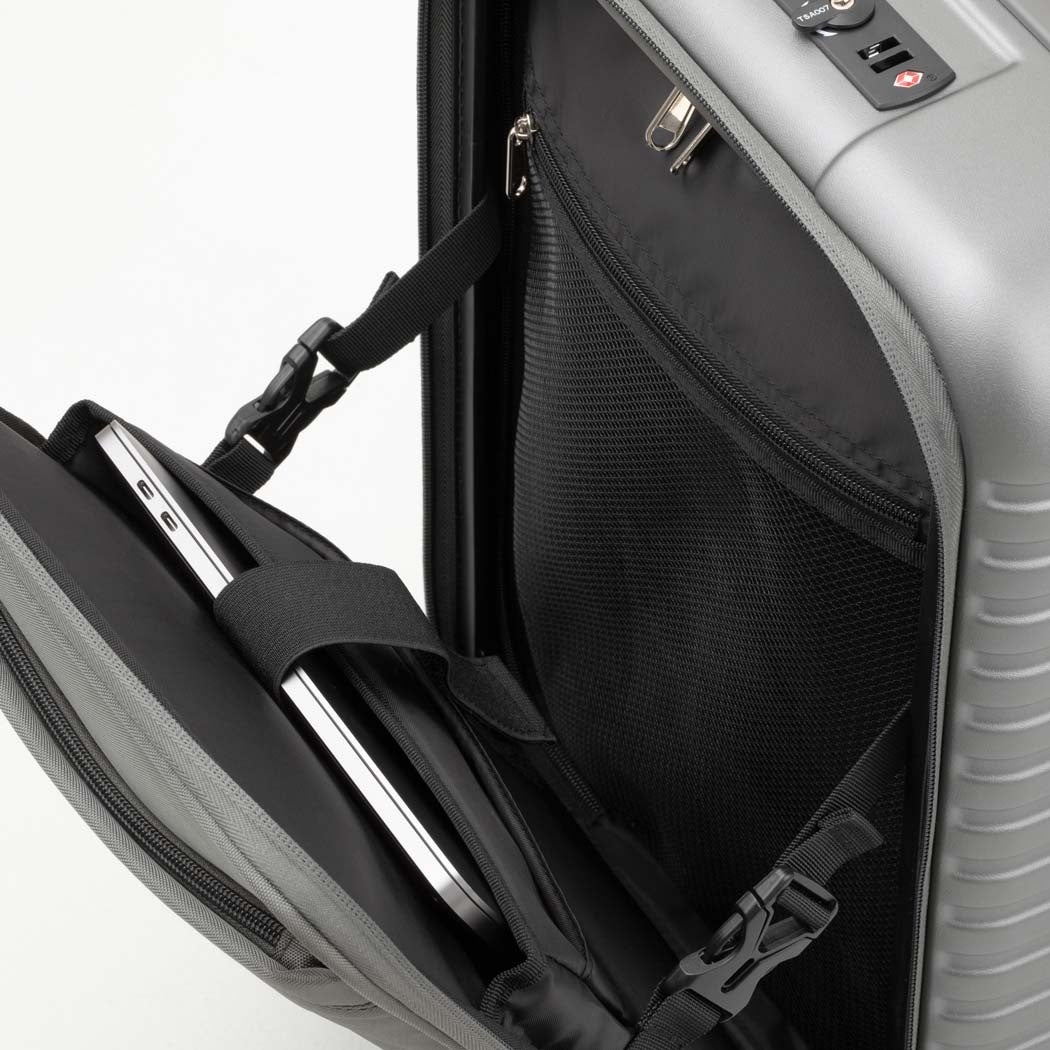 本体正面には、用途で使い分けできる2段ポケットを配置。上段は小物の出し入れに便利で、下段は内面が撥水仕様のため折り畳み傘やペットボトルなどの収納に適しています。フロントパネルの裏側には、PCやタブレットをそのまま収納できるクッション素材の仕切りポケットも装備。メイン収納へはフロントとセンターの両方からアクセスできるため、移動中でもスムーズに荷物を出し入れできます。さらに、容量拡張機能(+約3㎝)、ストッパー付クッションキャスター、フック機能付き台座など、あると便利な機能を多数搭載。出張や小旅行にも適した手軽でコンパクトなサイズ感で、様々なシーンでスーツケースを活用したい人にぴったりの多機能スーツケースです。