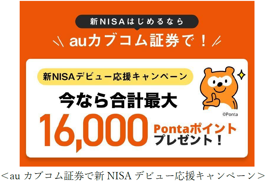 3.新NISAデビューキャンペーン (https://www.jibunbank.co.jp/campaign/2023/20231216_aukabucom/) (注2) | 下記①~④の条件をすべて満たすと6,000ポイントをプレゼント ①キャンペーン期間中にauカブコム証券のNISA口座を新規開設 ※特典はPontaポイントとして2024年4月末頃までに加算します。 | ・キャンペーン期間:2023年12月16日~2024年2月29日 ・取引対象期間:2023年12月16日~2024年3月29日 ※取引対象期間の適用は国内約定日で判定します。 |