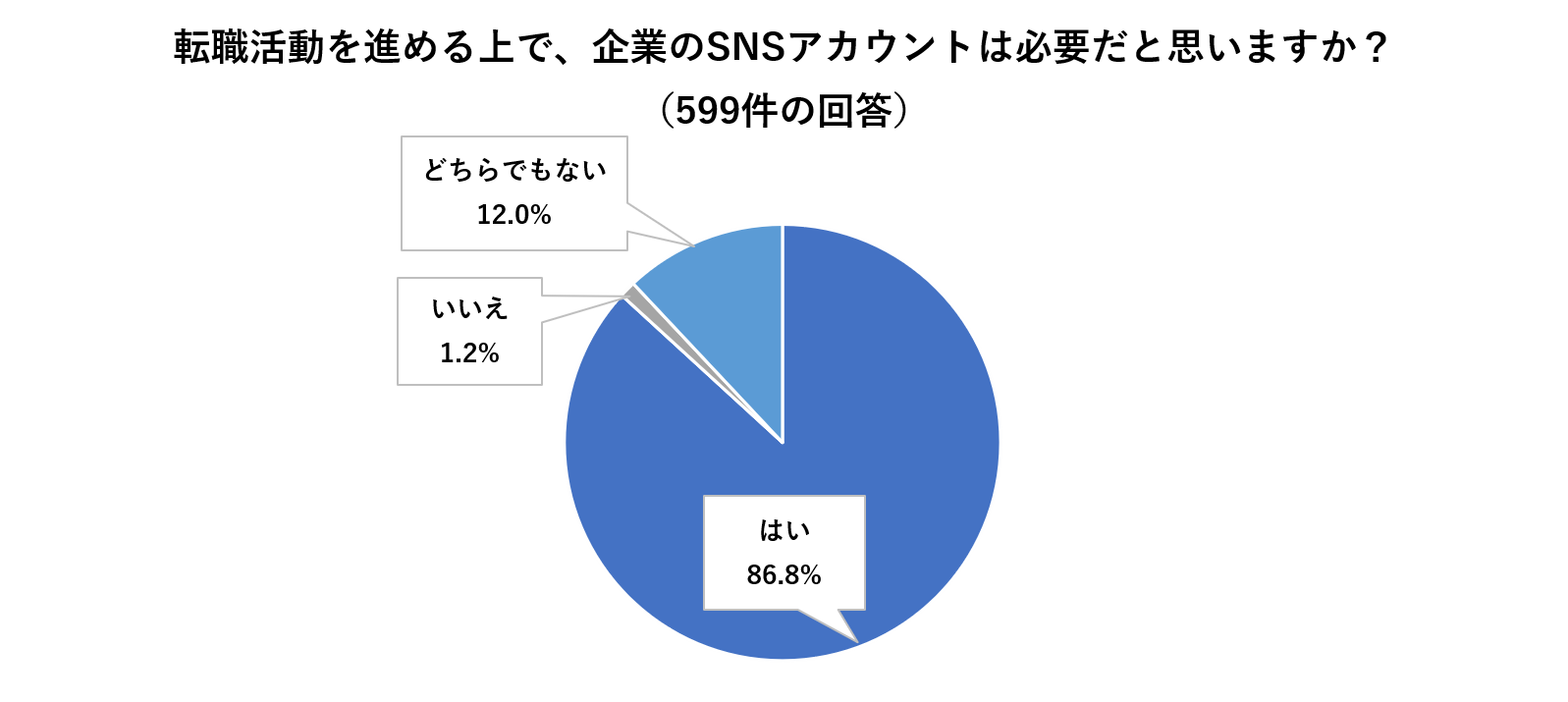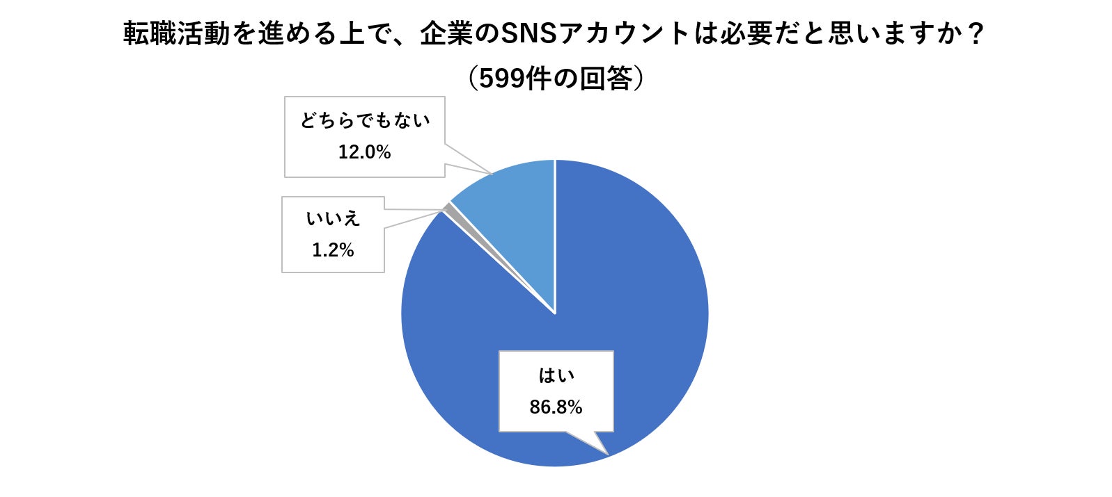 当社で行ったアンケート調査では、「転職活動を進める上で、企業のSNSアカウントは必要だと思いますか?」という質問に対し、86.8%が「必要だ」と回答。(※1)