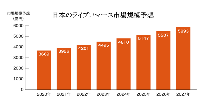 ライブコマースは、日本でも、成長が見込まれる市場として注目を集めています。ライブコマース市場規模の2027年の最大値予想は、5,893億円と見込んでいます。※