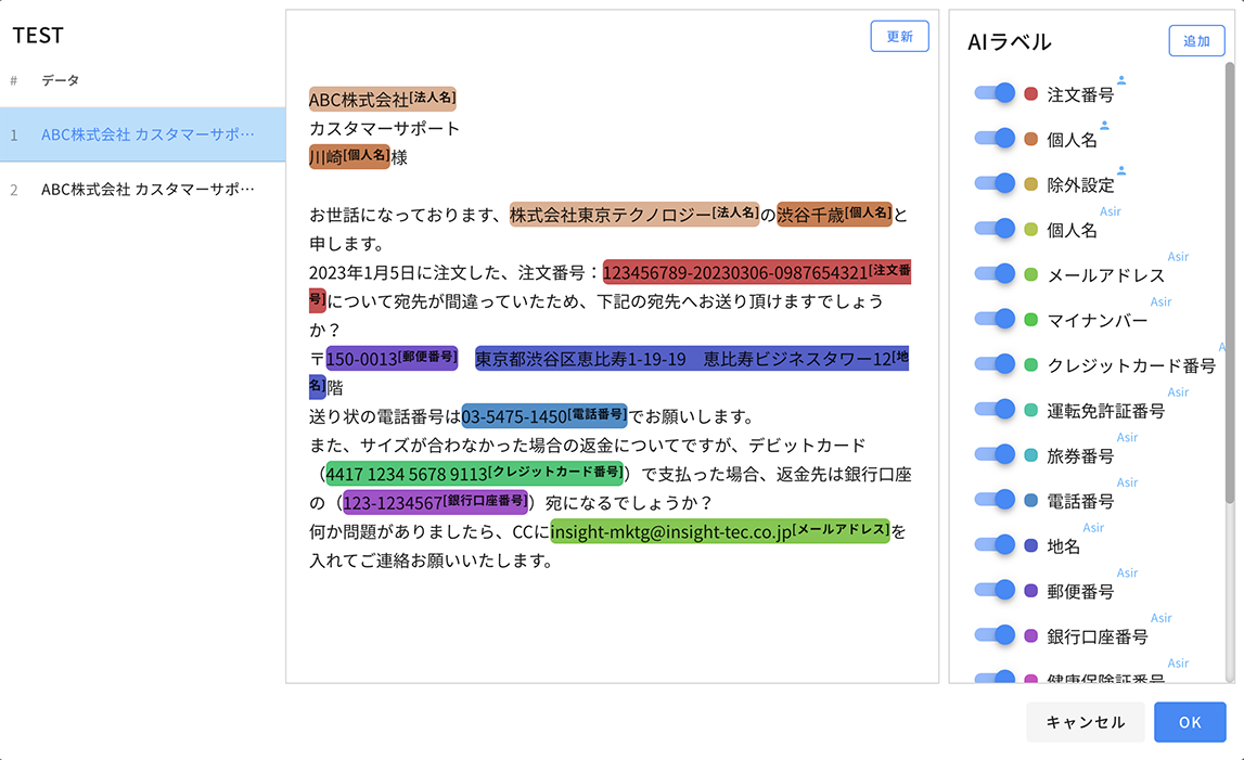 また、大規模言語モデルの進化によって生まれた高度なフリーテキストマスキング技術を搭載しており、メール本文、チャットのテキスト、CRM などの対応履歴・メモ欄といったテキストデータ内の個人情報(氏名や住所、電話番号、会社名 etc.)や機微情報を、リアルタイムかつ高速に匿名化・秘匿化し、保護することが可能です。