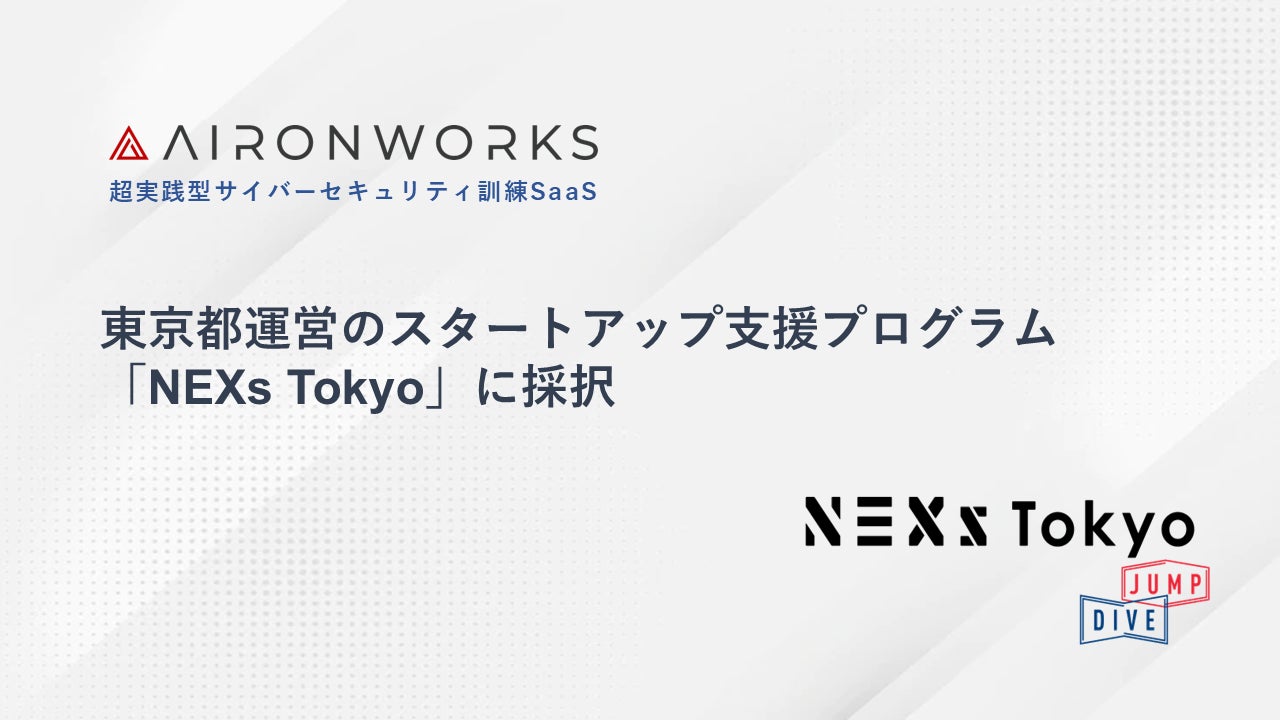 イスラエル発サイバーセキュリティSaaSを提供するAironWorks株式会社 (本社:東京都港区、代表取締役:寺田 彼日、以下「AironWorks」) は、東京都が運営する国内外の広域展開に挑むスタートアップのための連携事業創出プログラム「NEXs Tokyo」の『 JUMPコース』に第5期受講企業として採択されたことをお知らせいたします。
