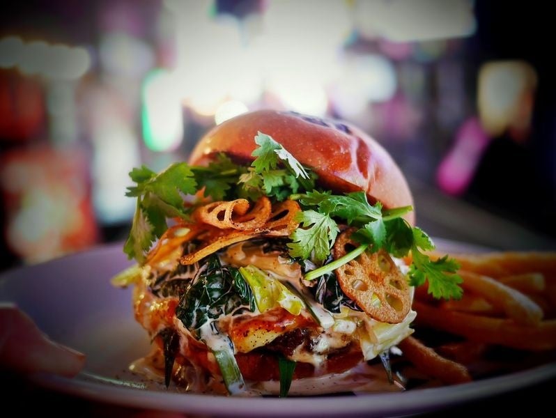 使い慣れている和牛とは違い、羊に独特なミルキーなまろやかさを感じ、それを生かしつつ香辛料で羊の癖を消すのではなく、和の食材を使用することで、酸味と苦味のバランスを調整、印象的な味わいのハンバーガーに致しました。