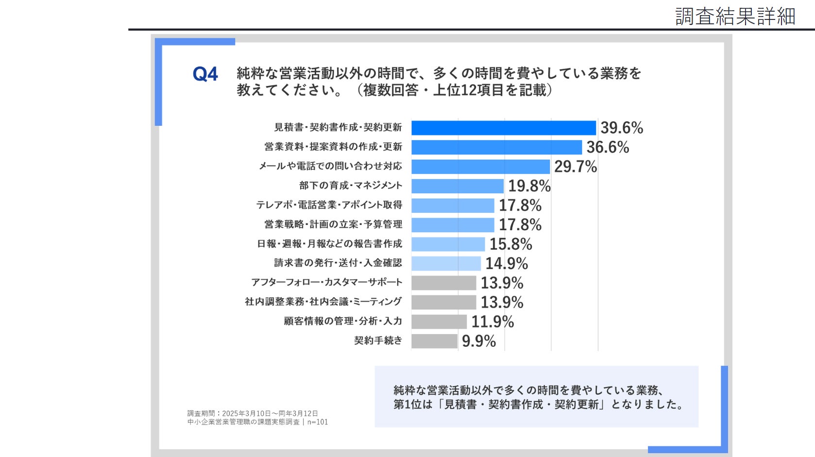 給与アップ研究所が中小企業の営業管理職101名に調査を行ったところ、営業活動における生産性向上が課題となっている企業が多いことがわかりました。解決を妨げている要因の一部を、以下に記載します。