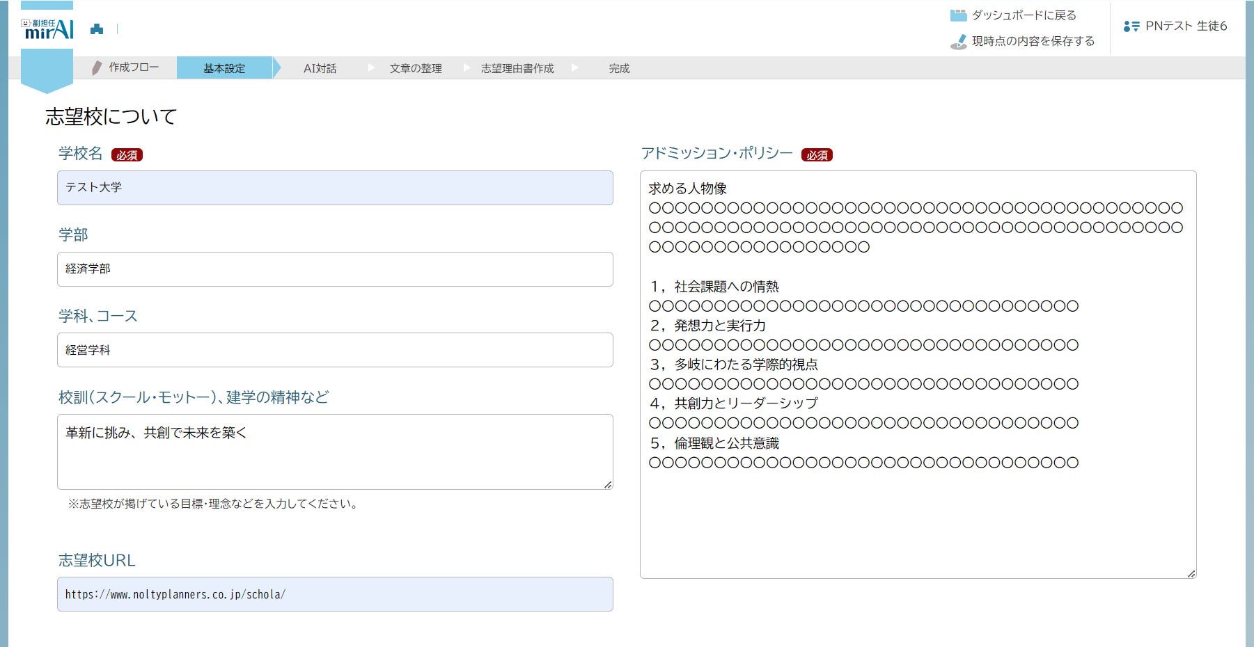 志望する大学・学部情報、アドミッション・ポリシーや高校時代に取り組んだことを入力し、mirAI先生に覚えさせます。