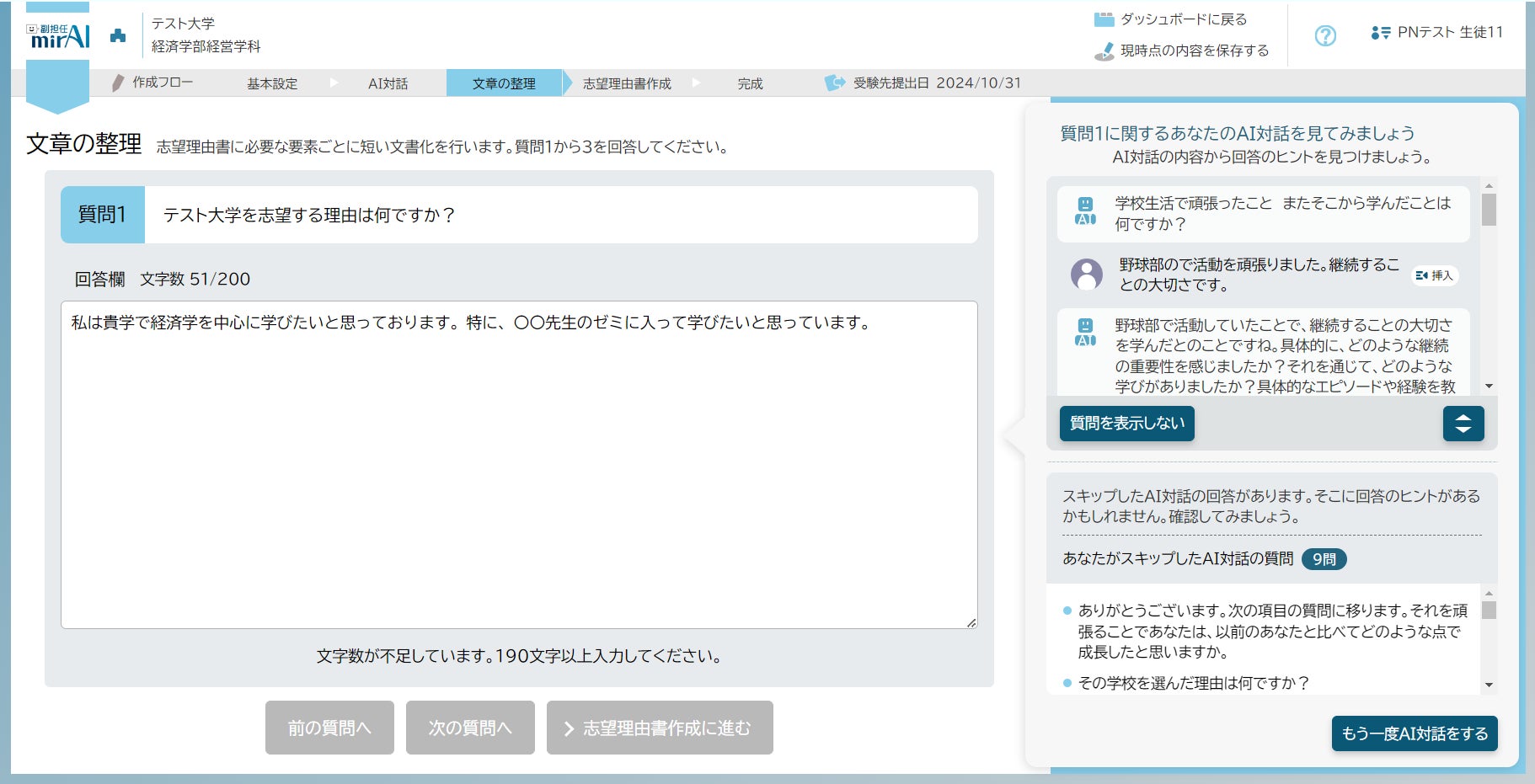 文章の整理で作成した文章をもとに志望理由書を作成します。作成過程でmirAI先生から内容のアドバイスや校正を受け、文章を整えることができます。これらにより文章に厚み持たせ、具体性のある内容になります。
