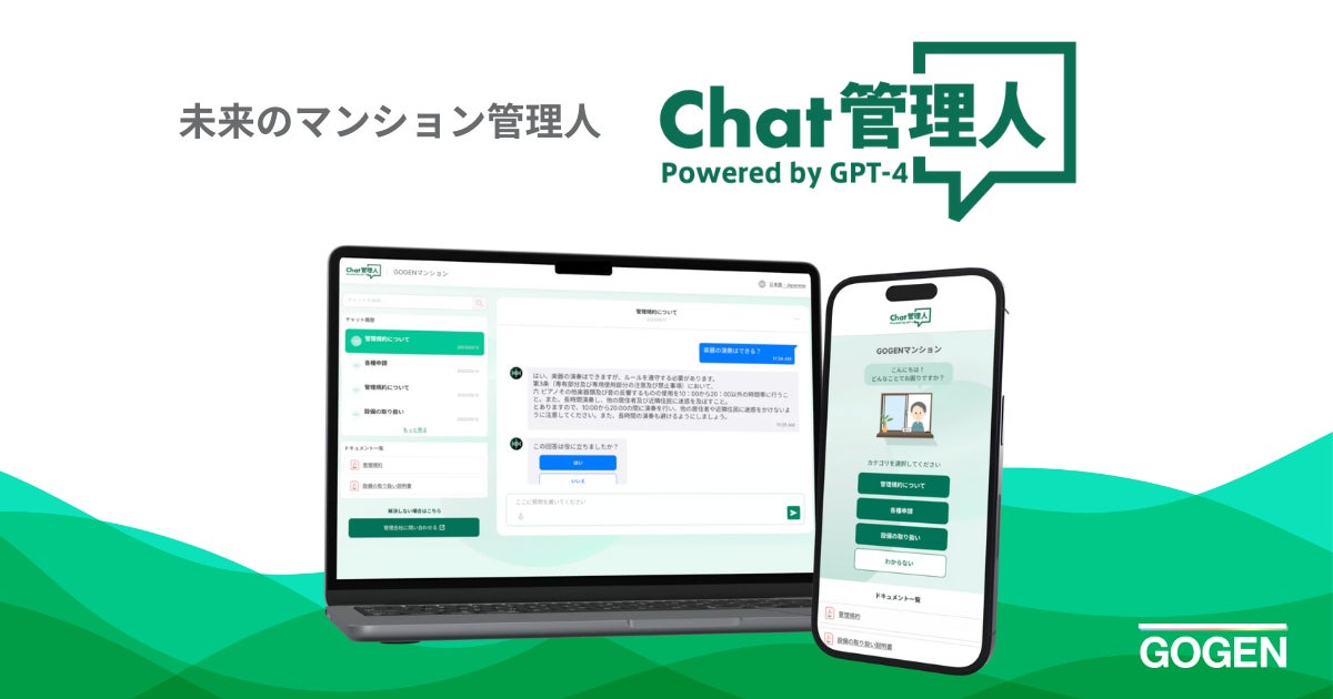 GOGEN株式会社(本社:東京都港区、代表取締役CEO:和田 浩明)は、OpenAI社が提供するChatGPTを活用した、マンション管理に纏わる相談・お問い合せ対応が可能なチャットサービス「Chat管理人 powered by GPT-4(β版)」(以下、Chat管理人)を開発・提供を開始したことをお知らせいたします。本サービスは、AI技術の最新鋭であるGPT-4を活用することで、24時間365日、住民のお問い合わせに即応が可能で、マンション管理会社の業務負担を大幅に軽減します。なお、現時点で確認される情報において、ChatGPTを活用したマンション管理関連サービスは、本件が日本において初めての事例となります(※)。