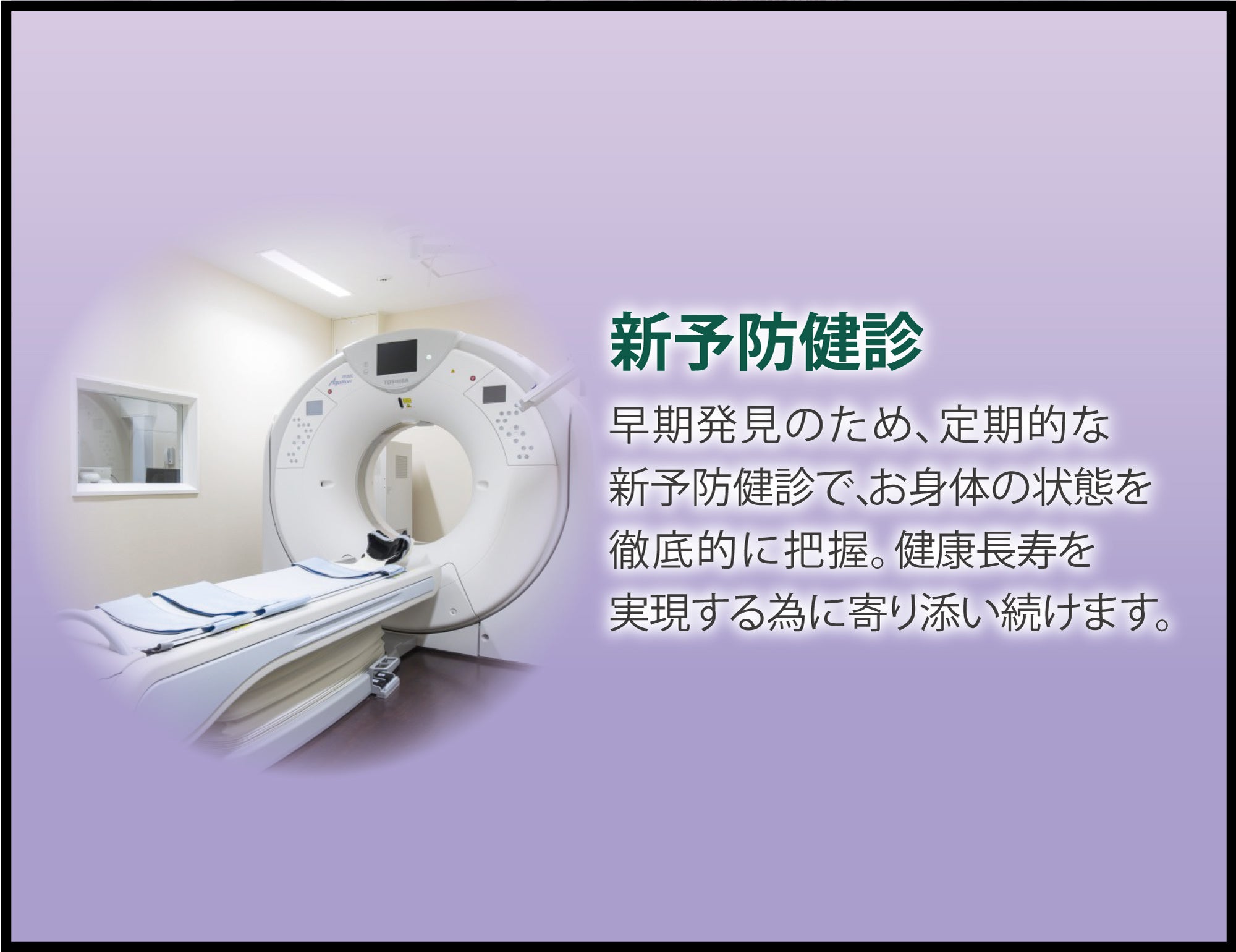 早期発見のため、定期的な新予防健診で、お身体の状態を徹底的に把握し、健康のパートナーとして暮らしをサポートいたします。何より皆様の健康長寿を実現する為に寄り添い続けてまいります。