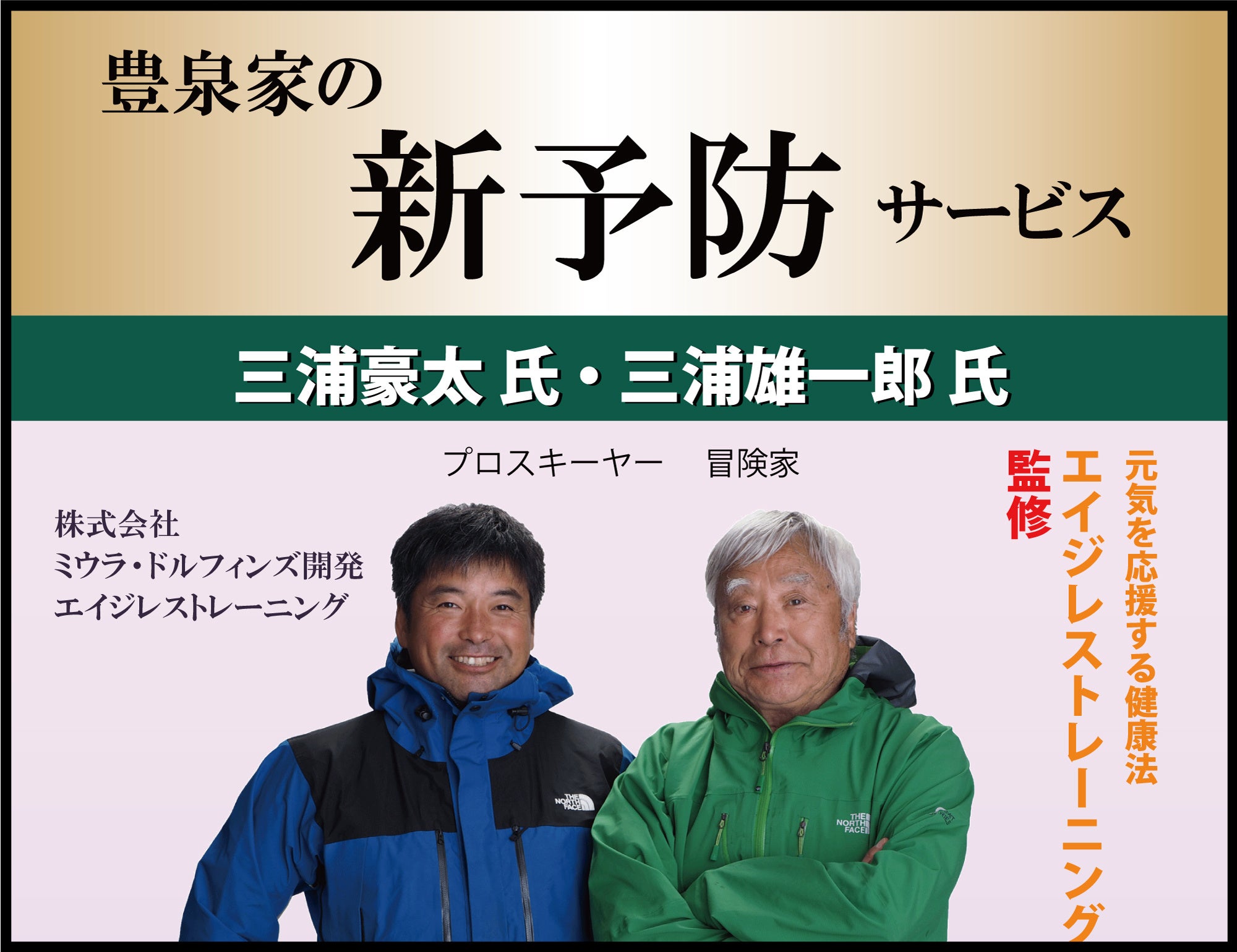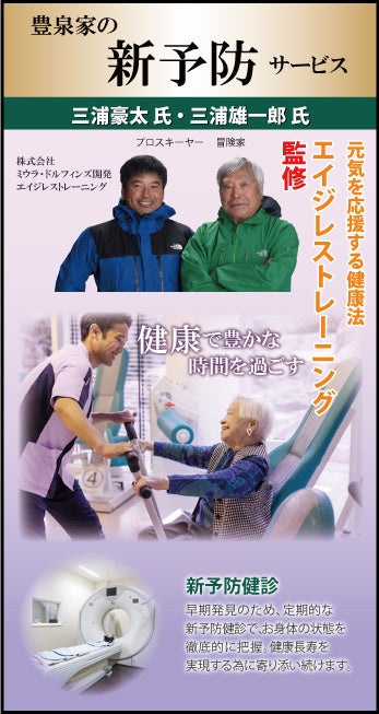 この度、入居いただく皆様に新予防サービスで、心も体も充実した日々を愉しんでいただくために、株式会社ミウラ・ドルフィンズ 三浦雄一郎氏、豪太氏による『エイジレストレーニング』を取り入れ、豊泉家の新予防を監修していただくことが決定いたしました。