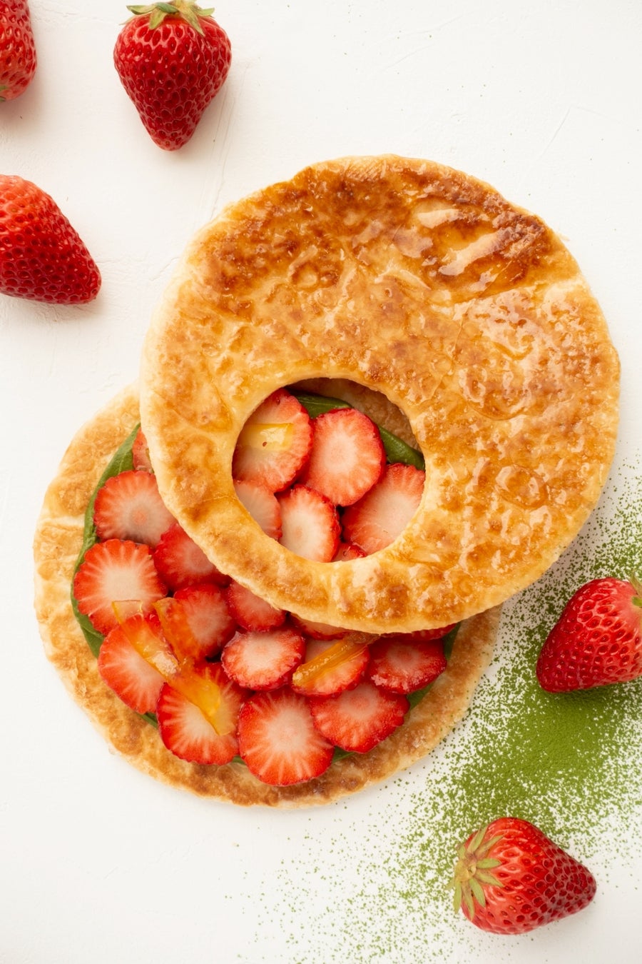 香り高い 宇治抹茶 を使用した濃厚な抹茶クリームに、旬を迎えた ジューシーな苺 をたっぷりトッピング。抹茶のほろ苦さと苺の甘酸っぱさが絶妙にマッチし、まさに “和と洋のいいとこ取り” を実現しました。