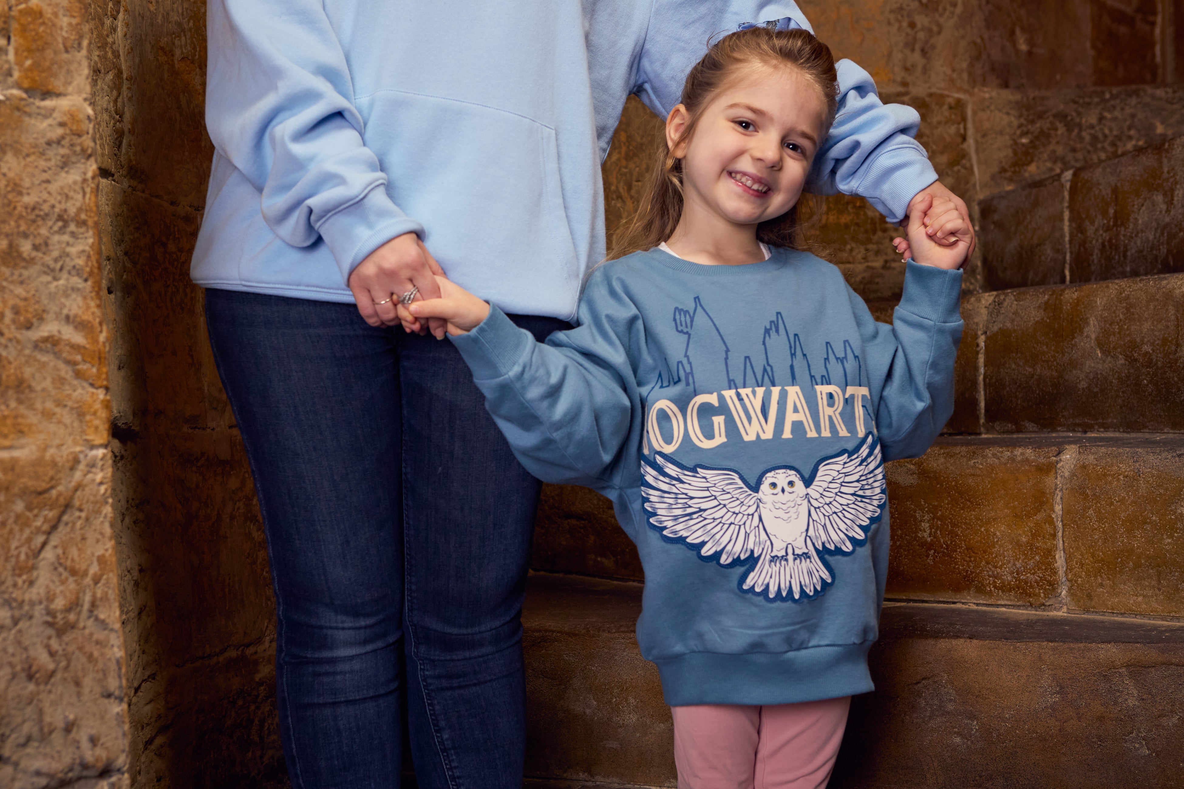 翼を広げたヘドウィグとクラシックな「ホグワーツ」の文字のワッペンが施された子ども用スウェット。100%コットンの柔らかなフィット感が優しく包み込みます。