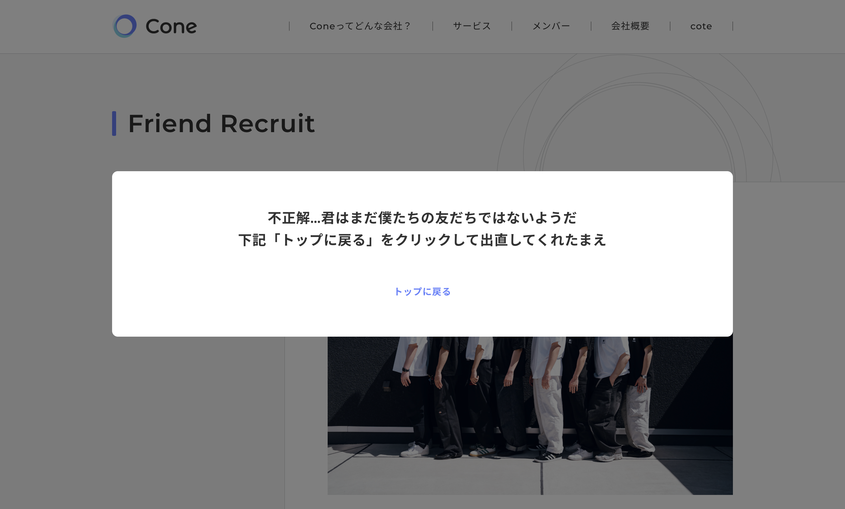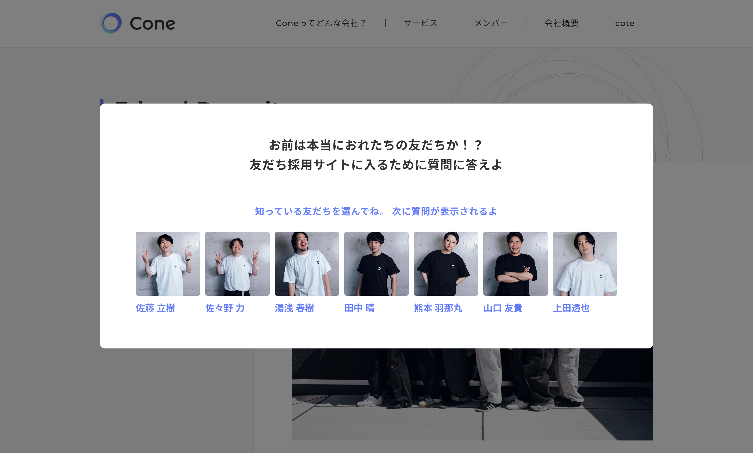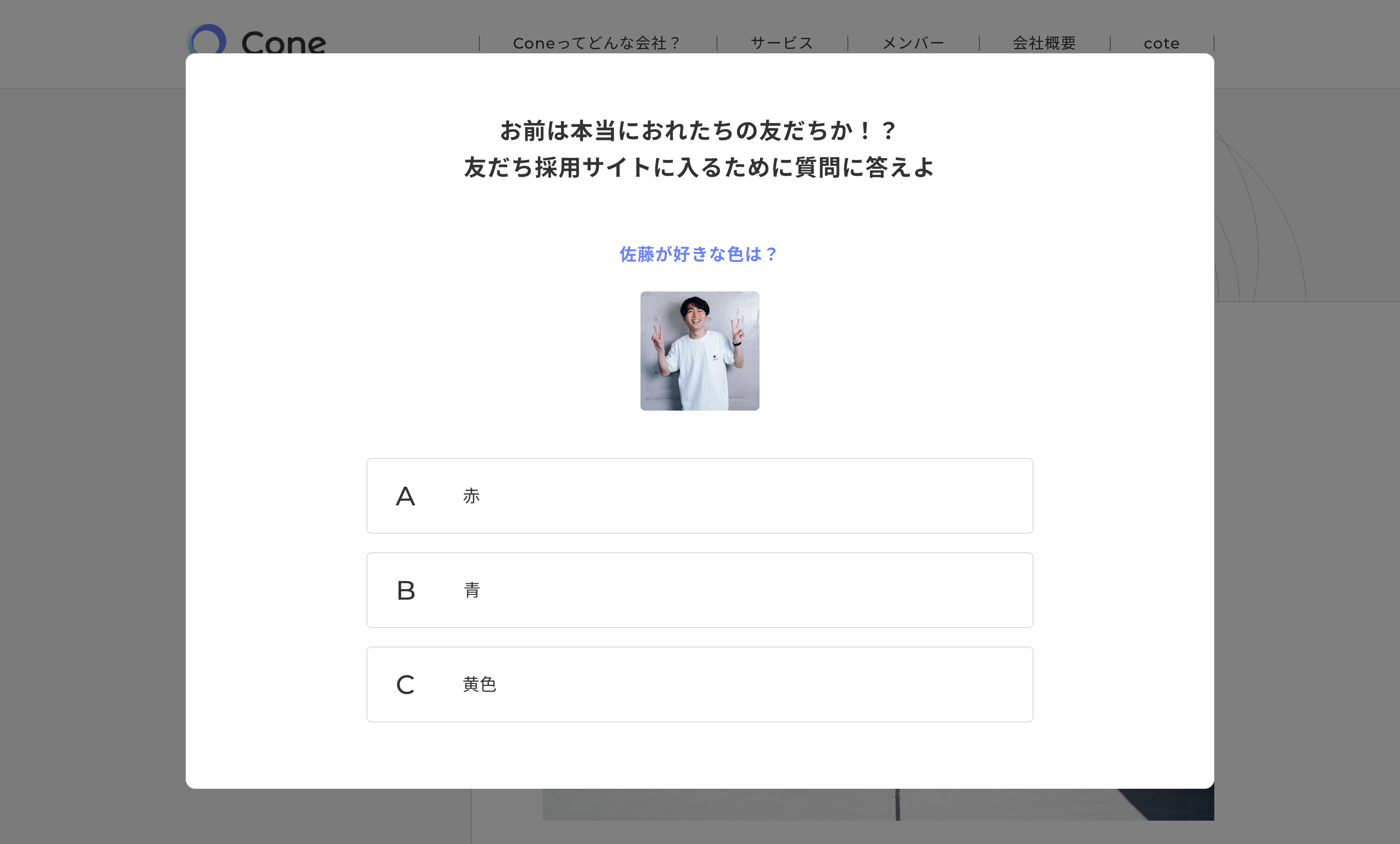 当社採用ページ(https://coneinc.jp/friend-recruit/)にアクセスすると、メンバーそれぞれに関する3択クイズがポップアップ表示されます。正解しなければ採用ページにアクセスできない仕様とし、「本当にメンバーを知っている人」のみが先に進める設計としました。