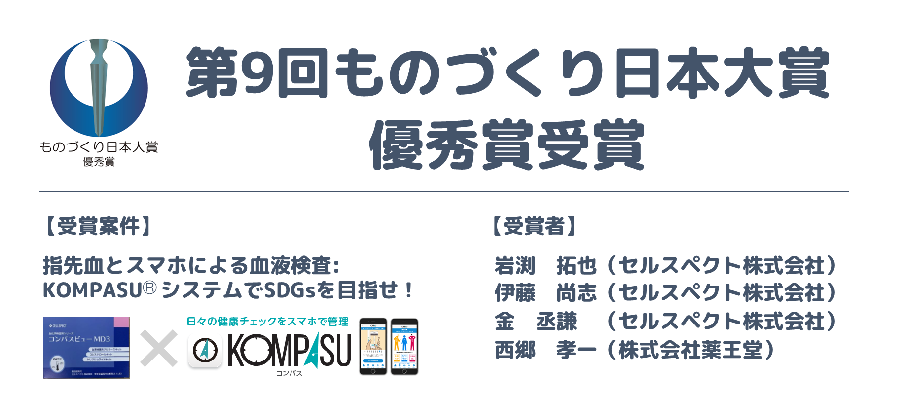 「東北から世界の健康をデザインする」を新ビジョンに掲げる当社グループの子会社であり、東北6県に381店舗のドラッグストアを展開する株式会社薬王堂(以下薬王堂)の取締役常務執行役員 西郷孝一と医療関連スタートアップのセルスペクト株式会社の代表取締役兼CEO 岩渕氏 他2名が、経済産業省・国土交通省・厚生労働省・文部科学省が主催する第9回「ものづくり日本大賞」において、「指先血とスマホによる血液検査: KOMPASU®システムでSDGsを目指せ!」で「優秀賞」を受賞しましたのでお知らせいたします。
