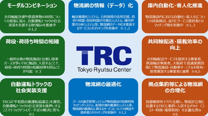 ※2 TRC敷地内にて物流TECHショールーム“TRC LODGE”を運営しており、ロボティクスやAI領域など様々なテック企業と連携し、多様化・変化していく物流ニーズに対し、価値創出につながる効率化・省力化ソリューションの提案機会を提供しています。また、構内に入居いただいているテナント様や南部流通業務団地の企業様向けに「物流課題解決セミナー」を開催し、テナント様との交流・マッチング機会の創出や物流最適地である平和島に拠点を構える企業の皆様へ物流ソリューションに対する知識やノウハウの共有を実施しています。