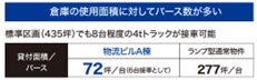 ※3 TRCのA・B棟は倉庫の奥行きが浅く、荷物の出し入れがしやすく、また倉庫面積に対してバース面積が多く、荷役・荷待ち時間短縮効果が期待できます。(A棟ではバース面積比率がランプ型通常物件の約3.8倍あり、435坪標準区画にてトラック8台程度接車可能となっております。)