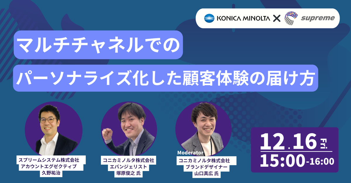 スプリームシステム株式会社(本社:東京都豊島区、代表取締役社長兼CEO:渡部 知博)は、2022年12月16日(金) 15時から株式会社コニカミノルタと共同で「マルチチャネルでのパーソナライズ化した顧客体験の届け方」と題した無料オンラインセミナーを開催いたします。