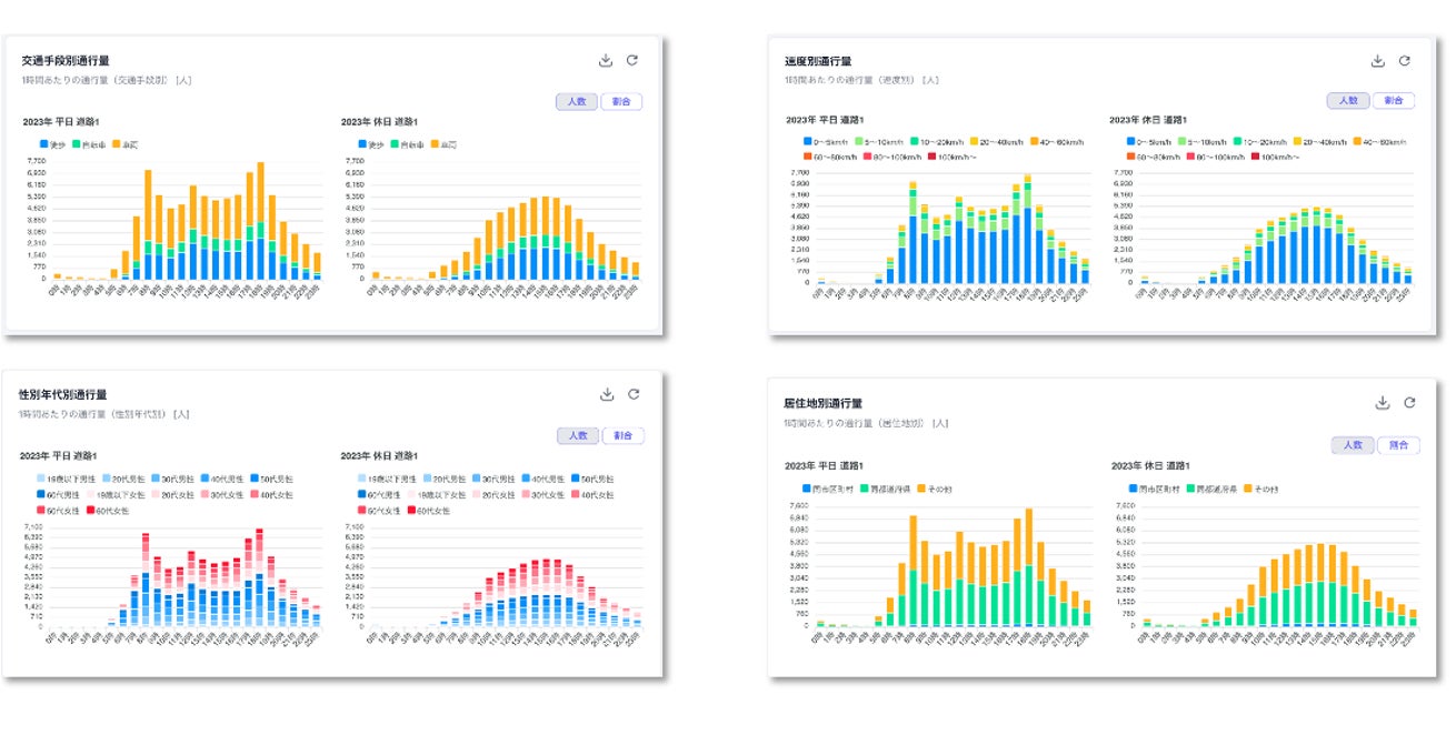 移動手段(徒歩・自転車・自動車)や速度、移動方向、性年代ごと、居住地別の時間帯別通行量を平日・休日に分けて把握することが可能です。また、調査したい道路を複数選択※し、一つにまとめて分析したり、各道路を比較して分析したりすることも可能です。