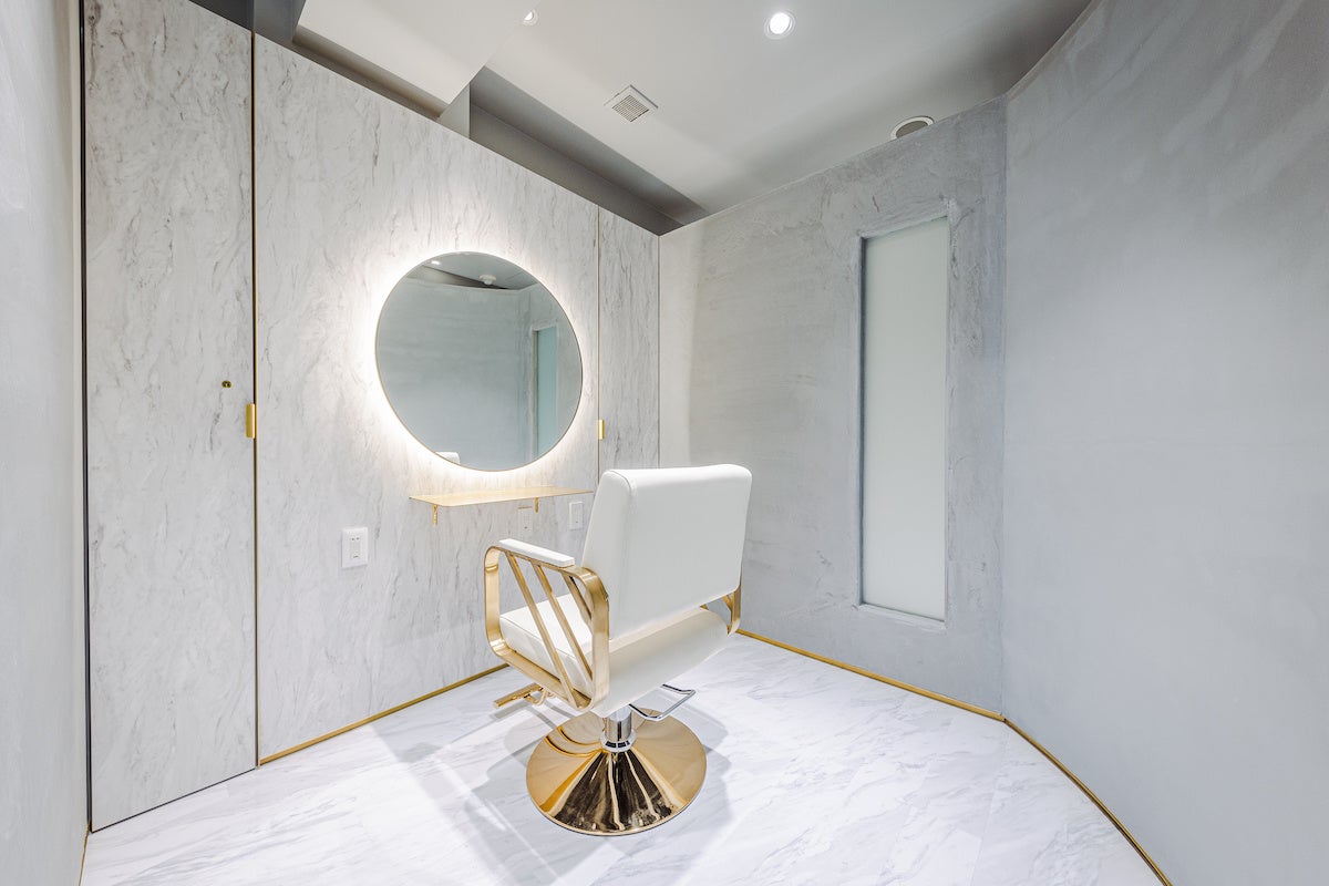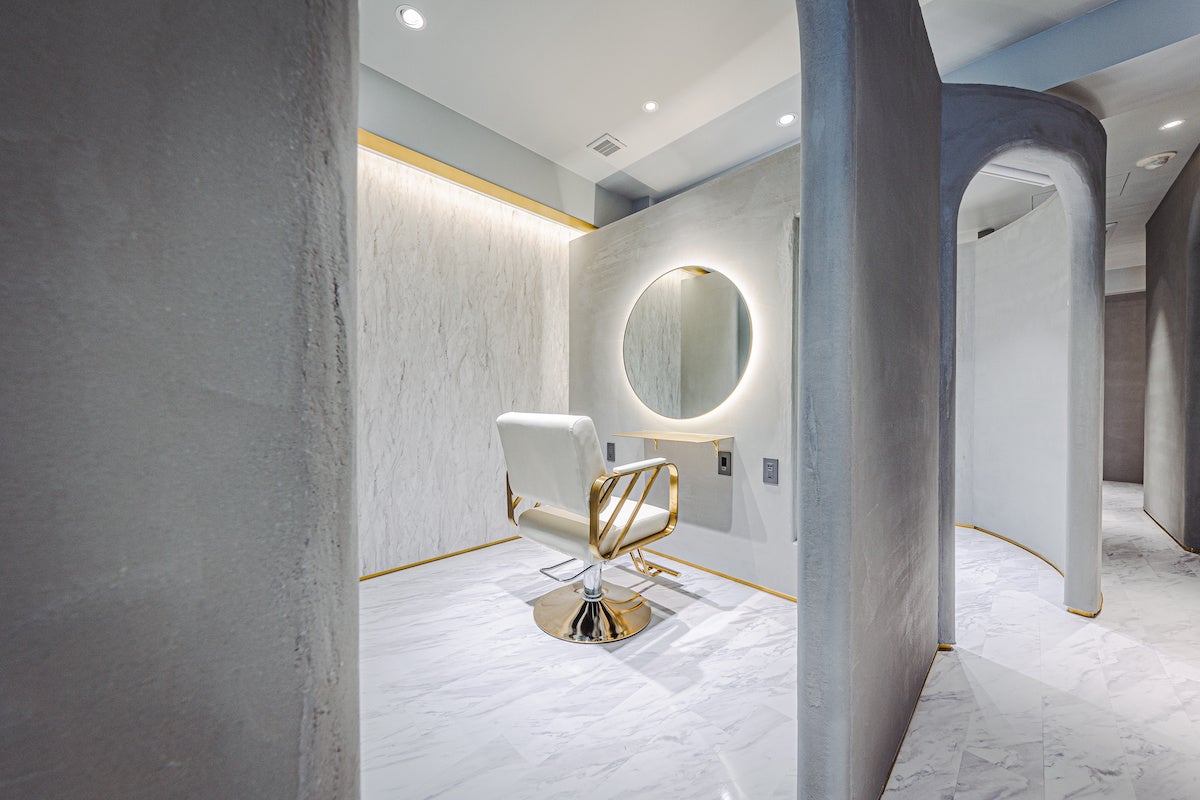 コンセプトは「髪を通じて1人1人に合った答えを導ける場所」。店内はホワイト、グレー、ゴールドを基調とした高級感あふれるデザインで統一されており、非日常的な時間を愉しんでいただける空間となっています。周りの目を気にせずゆったりとお過ごしいただけるよう、5つある部屋は全室完全個室を実現。圧倒的な居心地の良さとリラックスできる空間が特徴です。
