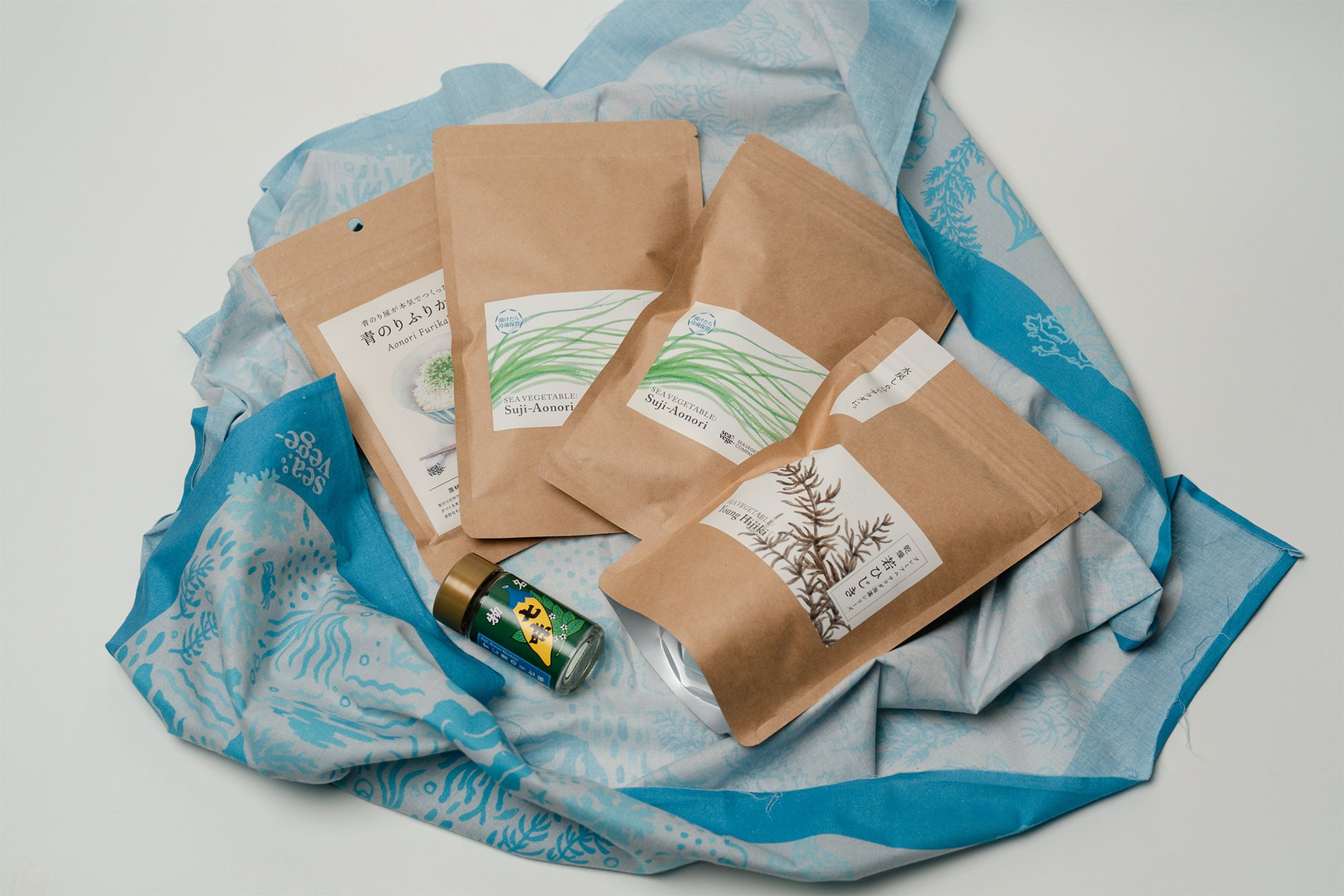 「EAT & MEET SEA VEGETABLE」の開催を記念した特別セットを、シーベジタブル公式オンラインストアで限定販売いたします。今回初めて販売する、海藻のイラストが入ったオリジナル風呂敷をはじめ、定番商品のすじ青のりや、八幡屋礒五郎とコラボレーションしたオリジナルのすじ青のり七味などがセットになっています。
