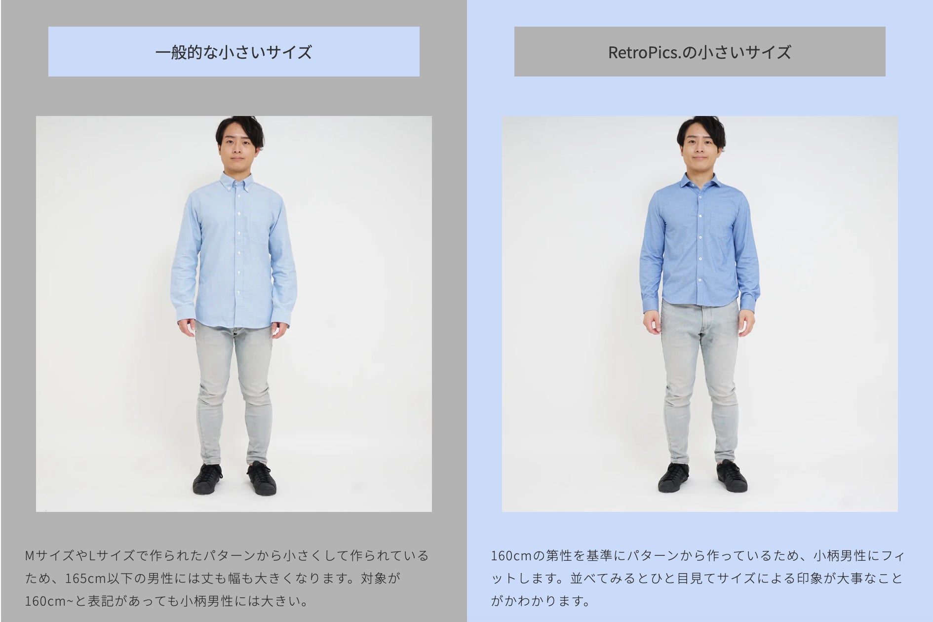 一般的なブランドではXSサイズを作ることが珍しく、しかもその場合でも身長160cm前後の男性にとっては大きすぎてダボダボになります。その結果、ファッションを楽しむどころか、「買い物が辛い」という悩みが生じ、ファッション業界から取り残されている現状があります。買える服がないため、しぶしぶレディース服や子供服を着用する方も多数いますが、形や生地感が異なるため、やはり大人の男性が着用する相応しい服が求められています。レトロピクスでは、「小柄男性にファッションの喜びを」を理念に、そうした悩みを抱える男性に対し、解決策としての洋服を提案しています。