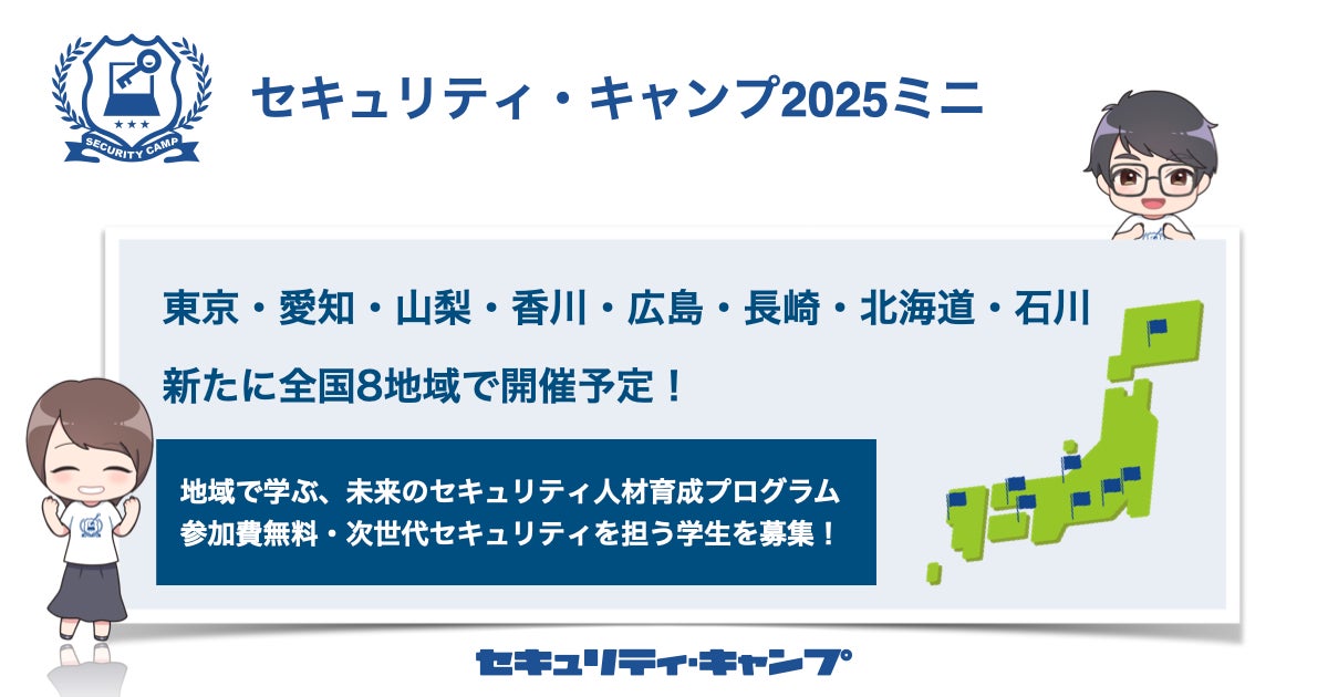 次代を担う日本発で世界に通用する若年層の情報セキュリティ人材を発掘・育成することを目指す一般社団法人セキュリティ・キャンプ協議会は、2025年度も「セキュリティ・キャンプミニ(以下、ミニキャンプ)」を全国各地で開催することを決定しました。