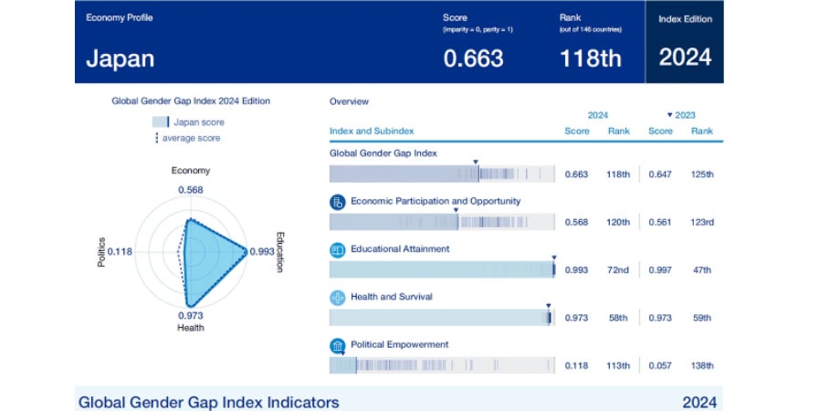 世界経済フォーラム(WEF)は6月12日、「Global Gender Gap Report」を公表し、各国で男女格差を測るジェンダー・ギャップ指数(Gender Gap Index:GGI)を発表しました。「経済」「教育」「健康」「政治」の4つの分野から算出されるこの指数によると、日本は過去最低だった前年の125位からは順位が上がったものの、今年は146カ国中116位となり、依然として低い順位にとどまりました。
