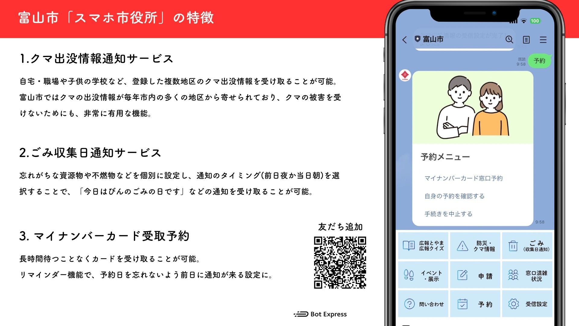 富山市は、デジタル技術やデータ等の活用により市民生活の質や利便性の向上を図る「富山市版スマートシティ」の実現を目指しています。その取組の一環として、LINE公式アカウントの拡張ツールであるGovTech Expressを導入し、富山市LINE公式アカウントの運用を開始しました。