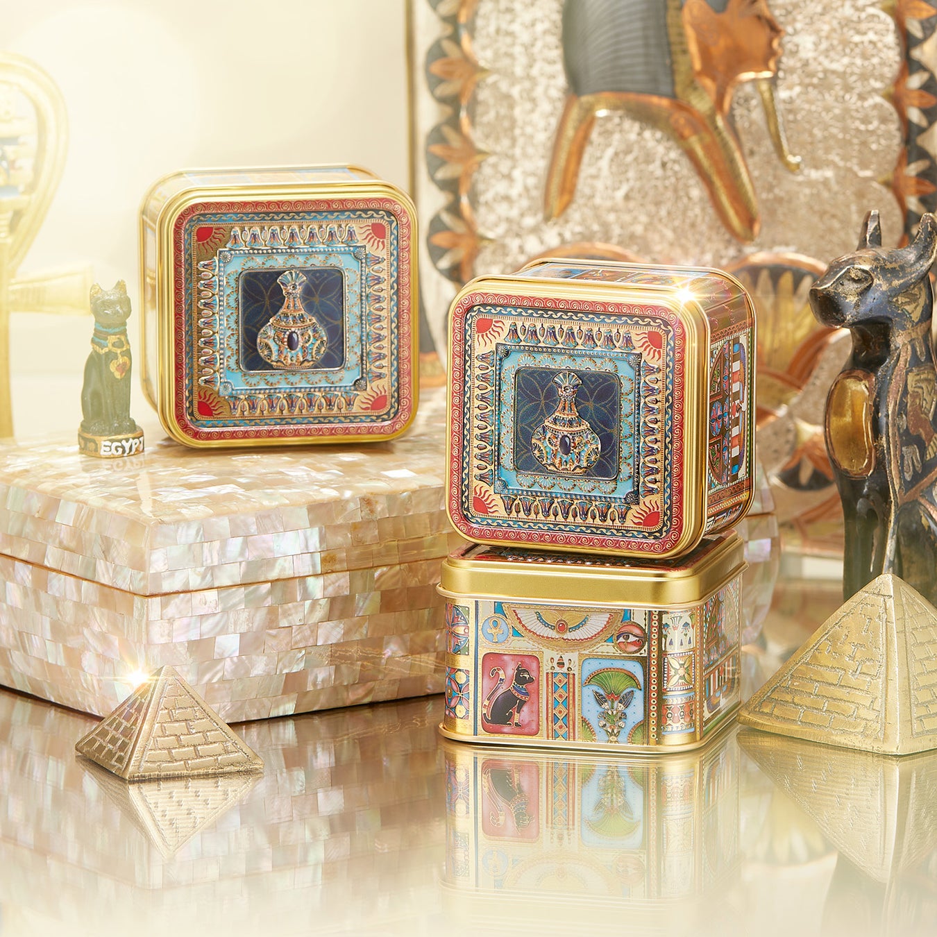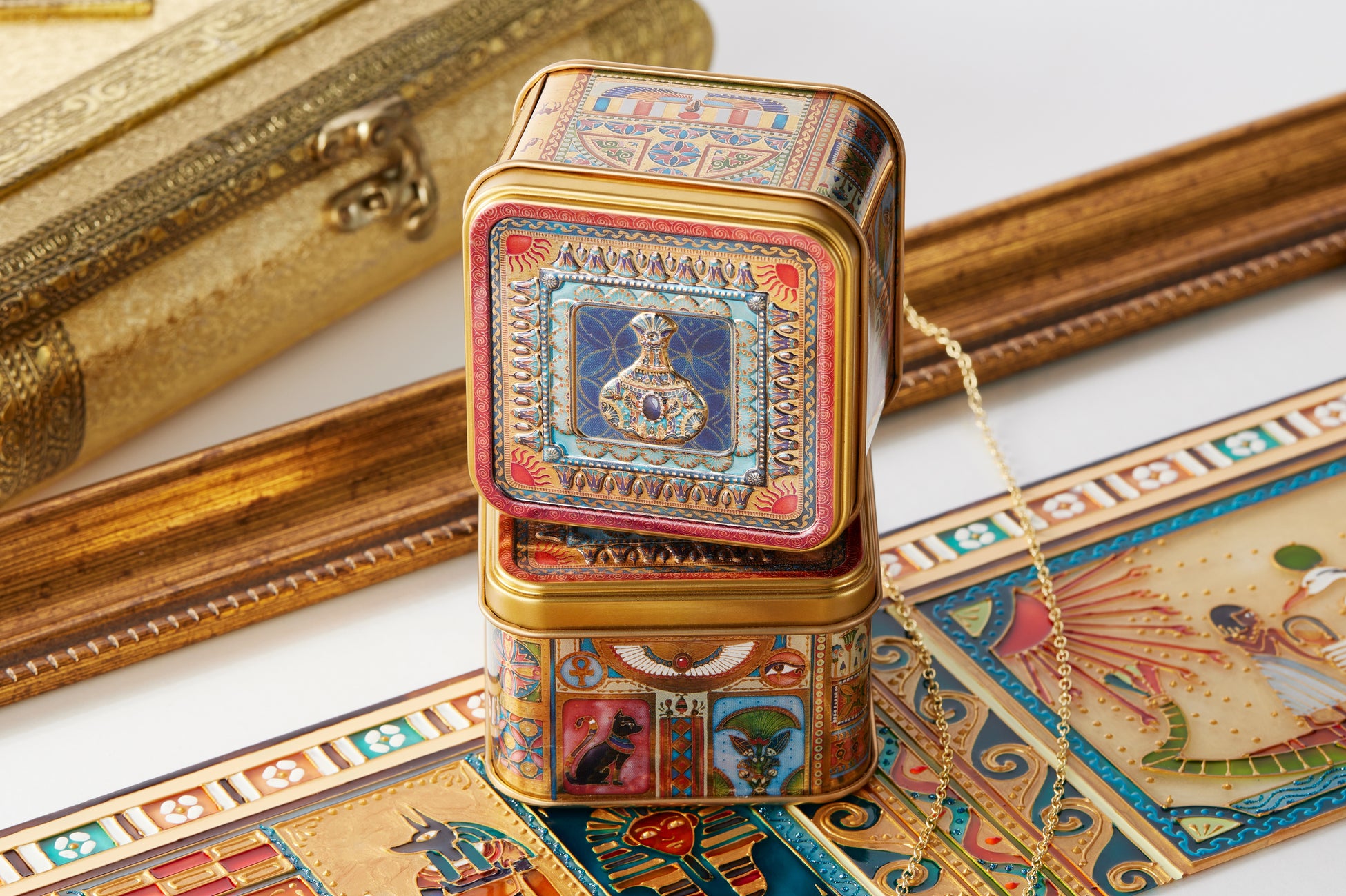 特別展示『ACN ラムセス大王展 ファラオたちの黄金』限定、ガラス絵で描いた『エジプト缶』新発売。古代エジプト人が愛したミルク風味のクッキー入り
