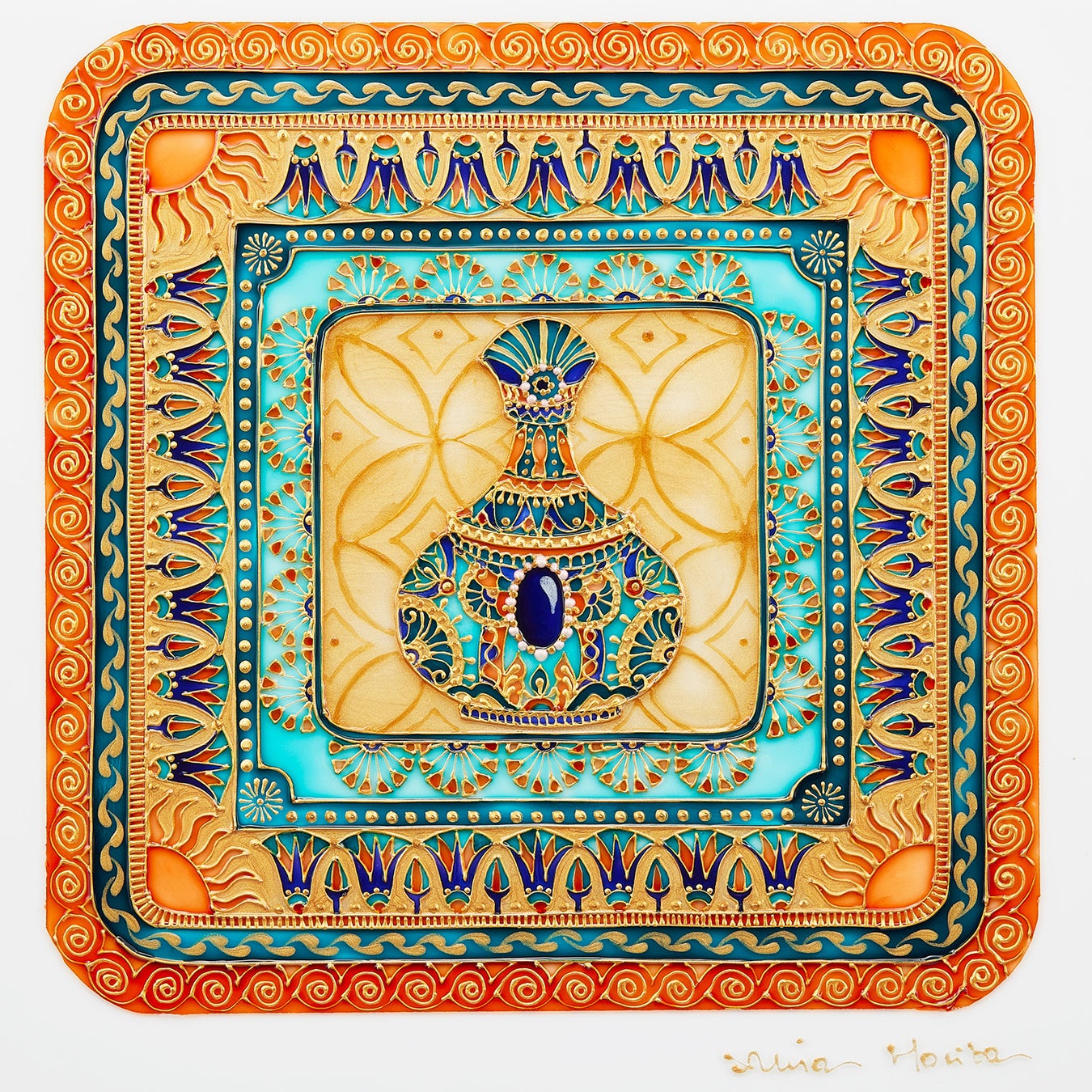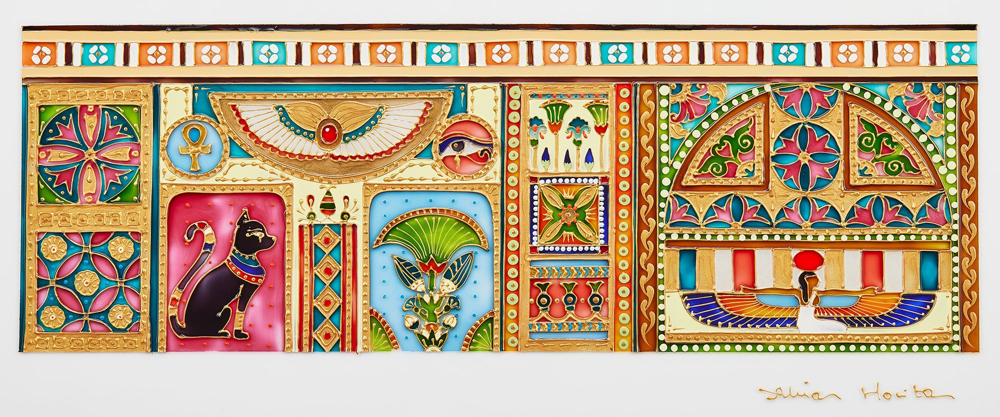 缶の側面には、古代エジプトの壁画をイメージしたイラストや、古代エジプトの独特な模様をあしらった2枚のガラス絵をデザインしました。