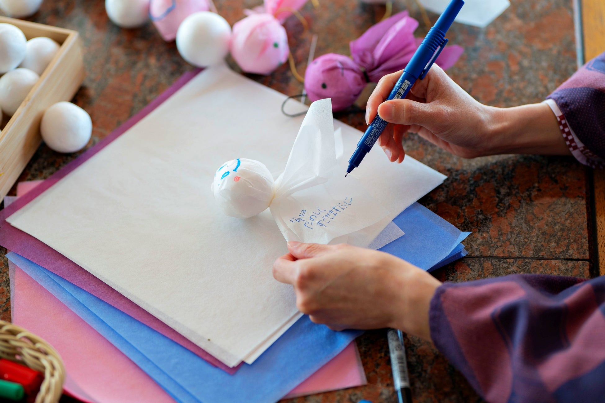 てるてる坊主はご自身の願いの数に合わせて、何枚でも自由にお作りください。また本来のてるてる坊主と異なり当館では先に顔を描き入れても問題ありません。自由に自分だけの可愛らしいてるてる坊主を作ってみてください。