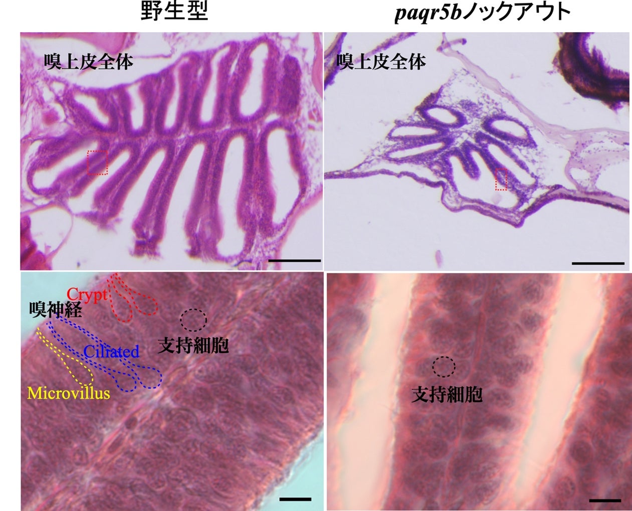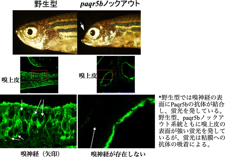 細胞膜上に存在するステロイド膜受容体を介したステロイドホルモンのノンゲノミック作用経路についてはステロイドの新規作用経路として世界的に研究が進められている。ステロイド膜受容体のうち、最初に発見されたプロゲステロンの膜受容体であるPaqr遺伝子群は生殖細胞の分裂制御や癌細胞の増殖などへの関与を示す多くの報告がなされているものの決定的な生理学的な機能証明は未だなされていなかった。徳元研究室ではゲノム編集技術により、Paqr遺伝子群の遺伝子ノックアウト系統を樹立することでこの遺伝子群の生理学的機能の証明を目指している。今回、Paqr遺伝子群の5番目の遺伝子であるpaqr5b遺伝子のノックアウト系統に興味深い変異を発見した。この系統の魚では頭部に異常がみられた(おでこが凹む)。頭部内部の構造をCTスキャンで観察したところ、鼻の構造が著しく小さくなっていることを発見した。そこで、嗅上皮を細胞レベルで観察したところ嗅上皮中の嗅神経が消失していることが明らかになった。この結果はPaqr5b受容体が嗅神経の分化に必要であることを示している。この発見はPaqr遺伝子の明確な生理機能を示した最初の報告であると共に、再生する神経細胞として特異な性質を持つ嗅神経の分化がプロゲステロン類により誘導されていることを示唆する興味深い発見である。