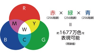 赤(256階調)×緑(256階調)×青(256階調)で約1677万色(理論値)を表現可能。