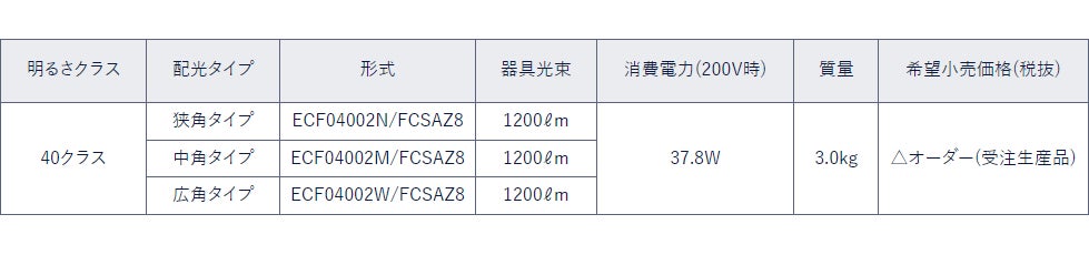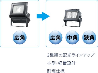 このたびのフルモデルチェンジにより、さらに小型・軽量化を実現し、3種類の配光(広角・中角・狭角)のラインアップを揃えました。