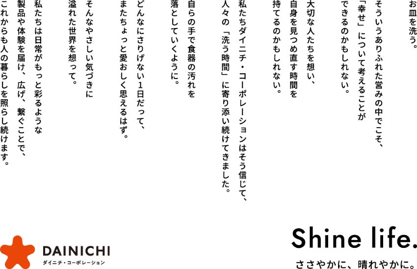 食器洗い用固形洗剤やスポンジなどのキッチン回りアイテムを製造・販売する株式会社ダイニチ・コーポレーションは創業50周年を迎え、新たにCI(コーポレートアイデンティティ)を発表します。新たなロゴ、タグライン、ブランドメッセージは、クリエイティブカンパニー株式会社スティーブアスタリスク(本社:東京都中央区、代表取締役社長:太田 伸志、以下「Steve* inc.」)とともに開発しました。今後も、ダイニチ・コーポレーションは、「洗い物に費やす時間にときめきを」をモットーに、いつもキッチンの傍らに『世界のスタンダード』として存在する商品を目指し取り組んでまいります。
