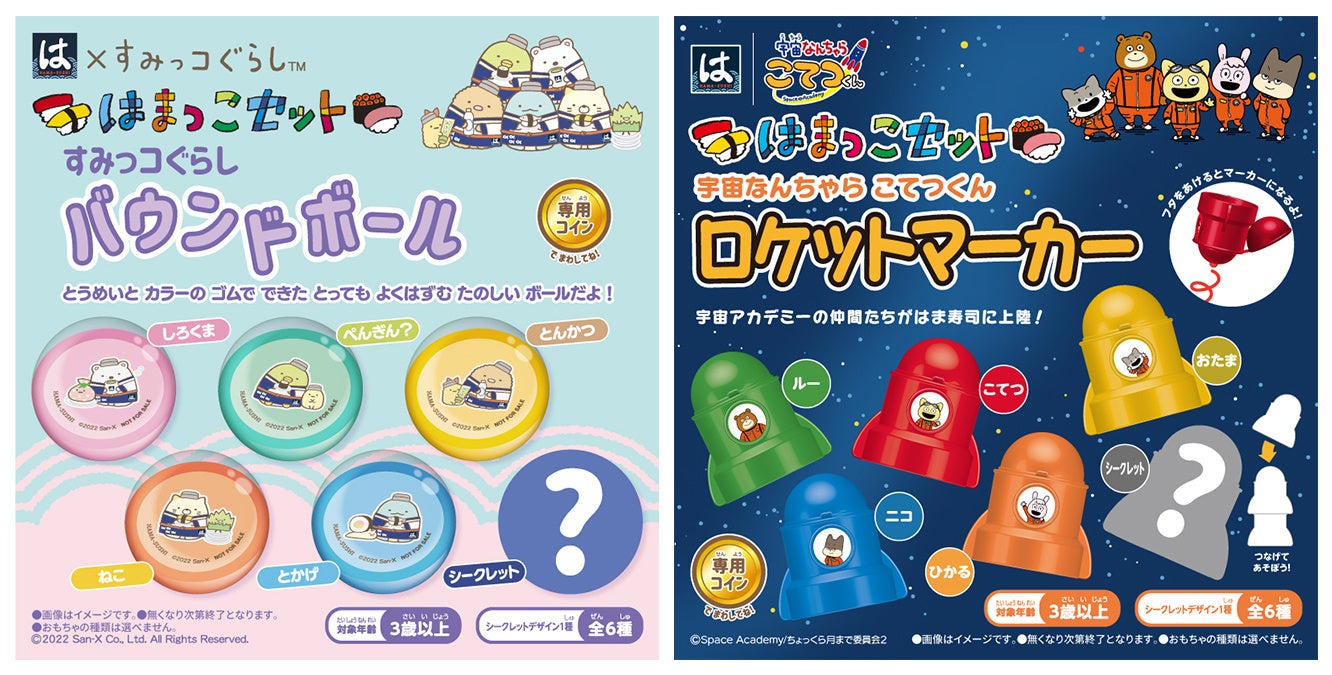 今回は、はま寿司のユニフォームを着た限定デザインの“すみっコ”たちが「バウンドボール」になって専用ガチャマシーンのおもちゃに登場します。さらに、宇宙なんちゃらこてつくんとその仲間たちが、つなげて遊べる「ロケットマーカー」として「はまっこセット」に初登場します。いずれもシークレットデザインをご用意しているので、なにが出るかはお楽しみです!