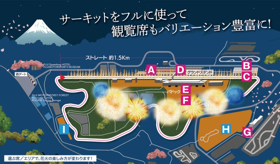 「富⼠⼭花⽕ vsスピードウェイ 2024」は、富⼠スピードウェイを中⼼に様々なモビリティ体験を提供する複合エリア「富⼠モータースポーツフォレスト」と連携した⼤規模花⽕イベントです。