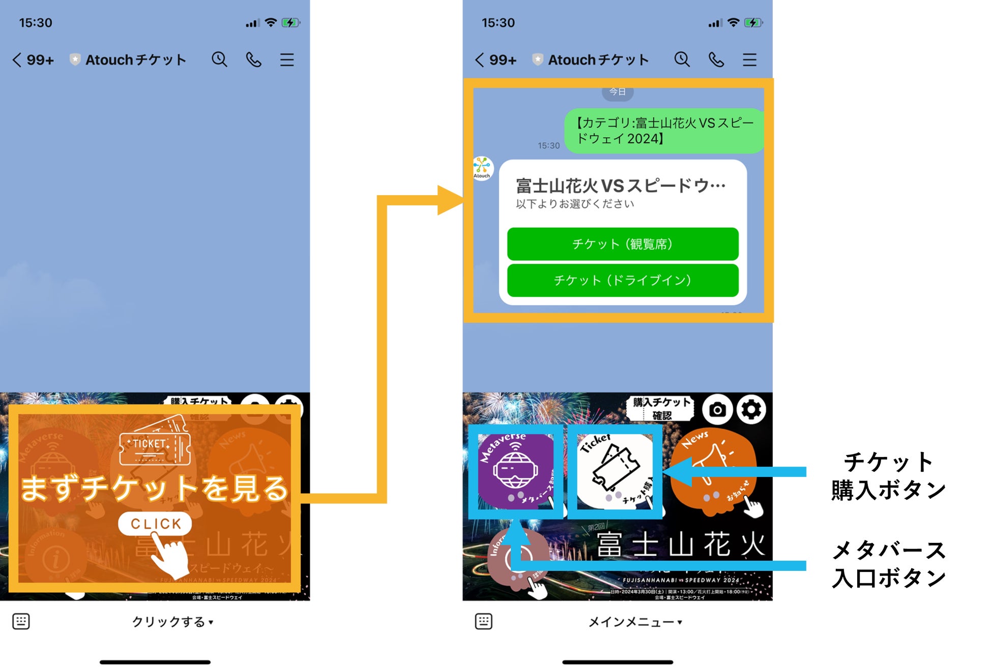 富⼠⼭花⽕の利⽤するサービス「Atouchチケット」のLINEを友だち追加していただくと、現地に⾏けるチ ケットの購⼊とメタバース会場への⼊場ができます。当⽇、現地に来られない⽅もこの機会に是⾮メタバースでの花⽕鑑賞をお試しください。