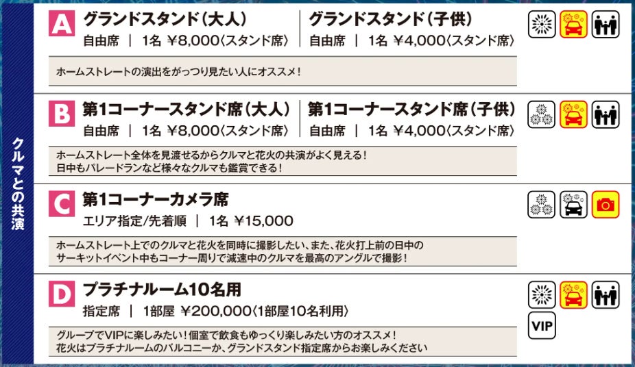 また、希少なスーパーカー等が出⾛するパレードランや、⾞と並⾛して打ち上がる花⽕など、花⽕とモータースポーツの競演ならではのエキサイティングな仕掛けを⽤意しています。