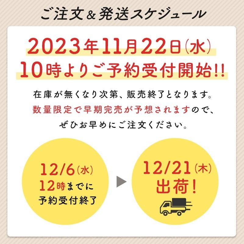 福袋の予約は、2023年11月22日10時から受付開始となります。12月6日(水)12時までのご注文分は、12月21日(木)に出荷させていただきます。