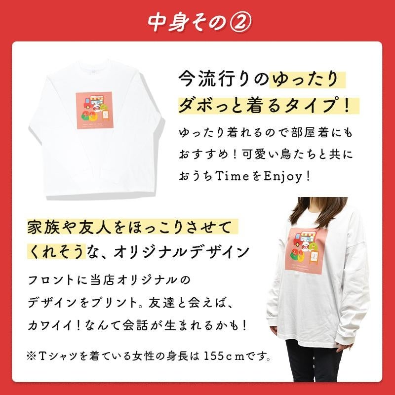 BIGシルエットが可愛い!ダボッと着られて、楽なのに1枚でキマる長袖Tシャツです。ことりさんたちがカフェの前でおしゃべりしたりジュースを飲んだり♪