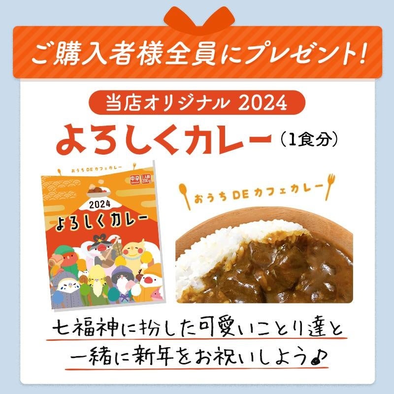福袋をご購入いただいた方全員に、当店オリジナルの2024年よろしくカレー(1食分)のプレゼント付きです。