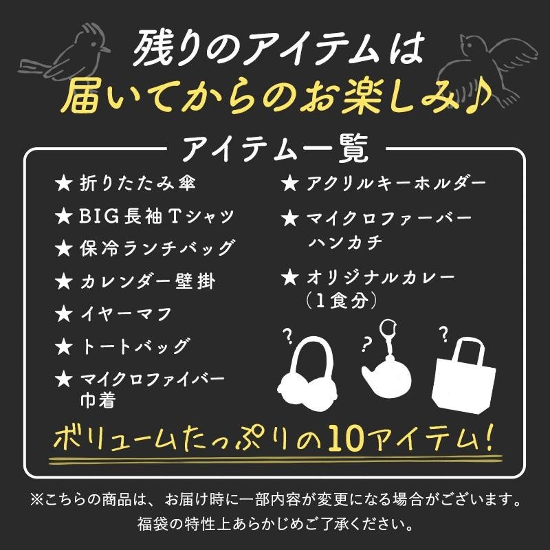 イヤーマフや長袖Tシャツと届いてすぐに使える冬アイテム・年中活躍する折り畳み傘やトートバッグなどなど…中身は新作ばかり!ボリュームたっぷりの10アイテムです♪