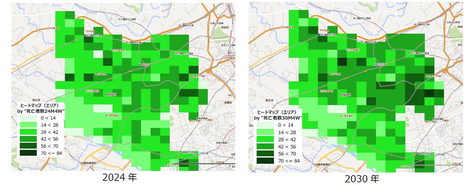 下の図は、MarketAnalyzer® 5で死亡者数データを可視化したイメージです。東京都世田谷区における、2024年/2030年(推計)の死亡者数を可視化し、このエリアでの死亡者数の推移を分析したものです。