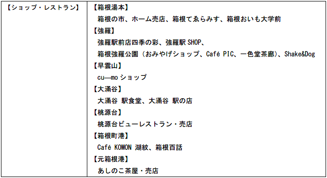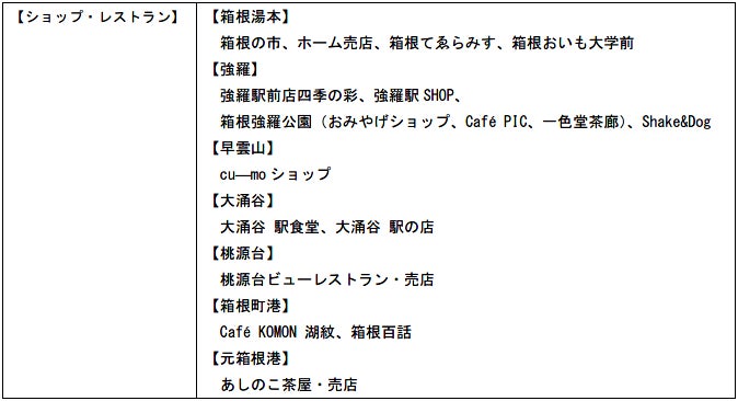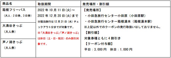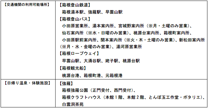 箱根エリアの8つの乗り物が乗り降り自由の周遊券「箱根フリーパス」や旅行のプランで選べる「大涌谷きっぷ」・「芦ノ湖きっぷ」、マイカー利用で便利な「海賊船・ロープウェイ乗り放題パス」の購入、お土産が充実・箱根湯本駅改札前「箱根の市」などで当クーポンを利用いただけます。また、一部店舗にて対象商品に限り当事業における割引販売を行います。