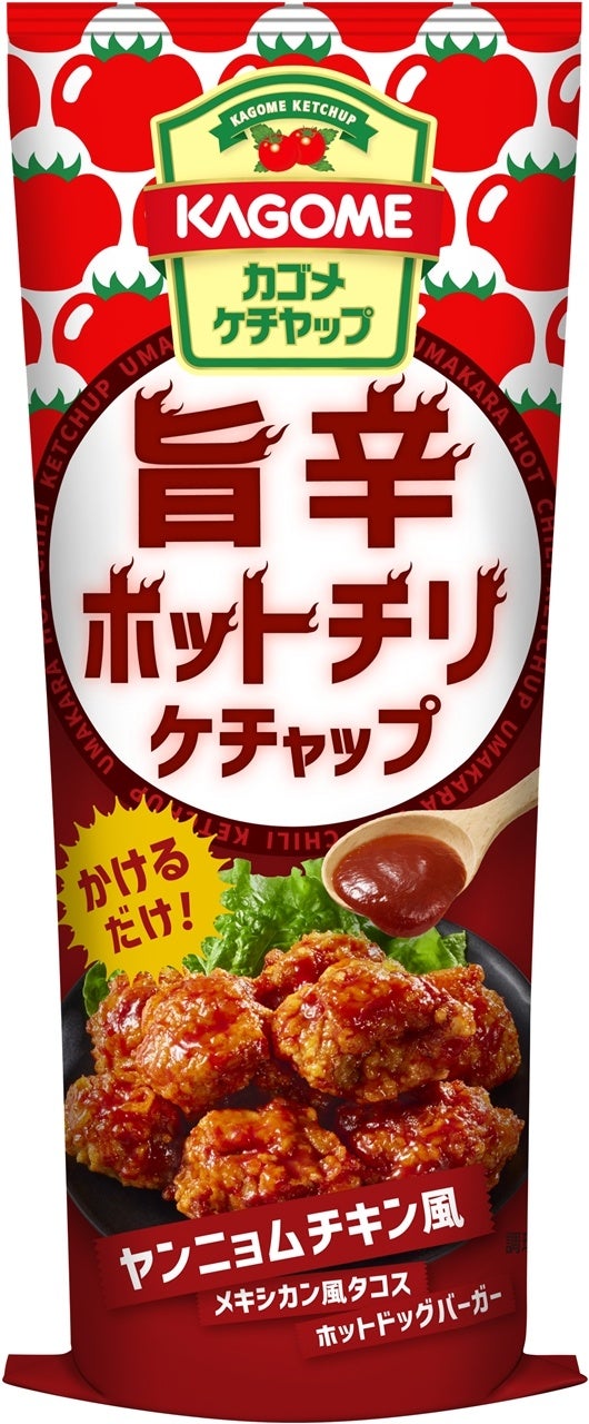 2品とも、ハンバーガーやホットドッグ、バーベキューのソースやポテトなど、つけたりかけたりするだけでやみつき感のあるおいしさをお楽しみいただけます。また、唐揚げにかけると、「スパイシーカリーケチャップ」は“タンドリーチキン風”、「旨辛ホットチリケチャップは“旨辛ヤンニョムチキン風”の味わいをお楽しみいただけ、主菜の1品として、旨辛スパイシーなメニューが手軽に広がります。