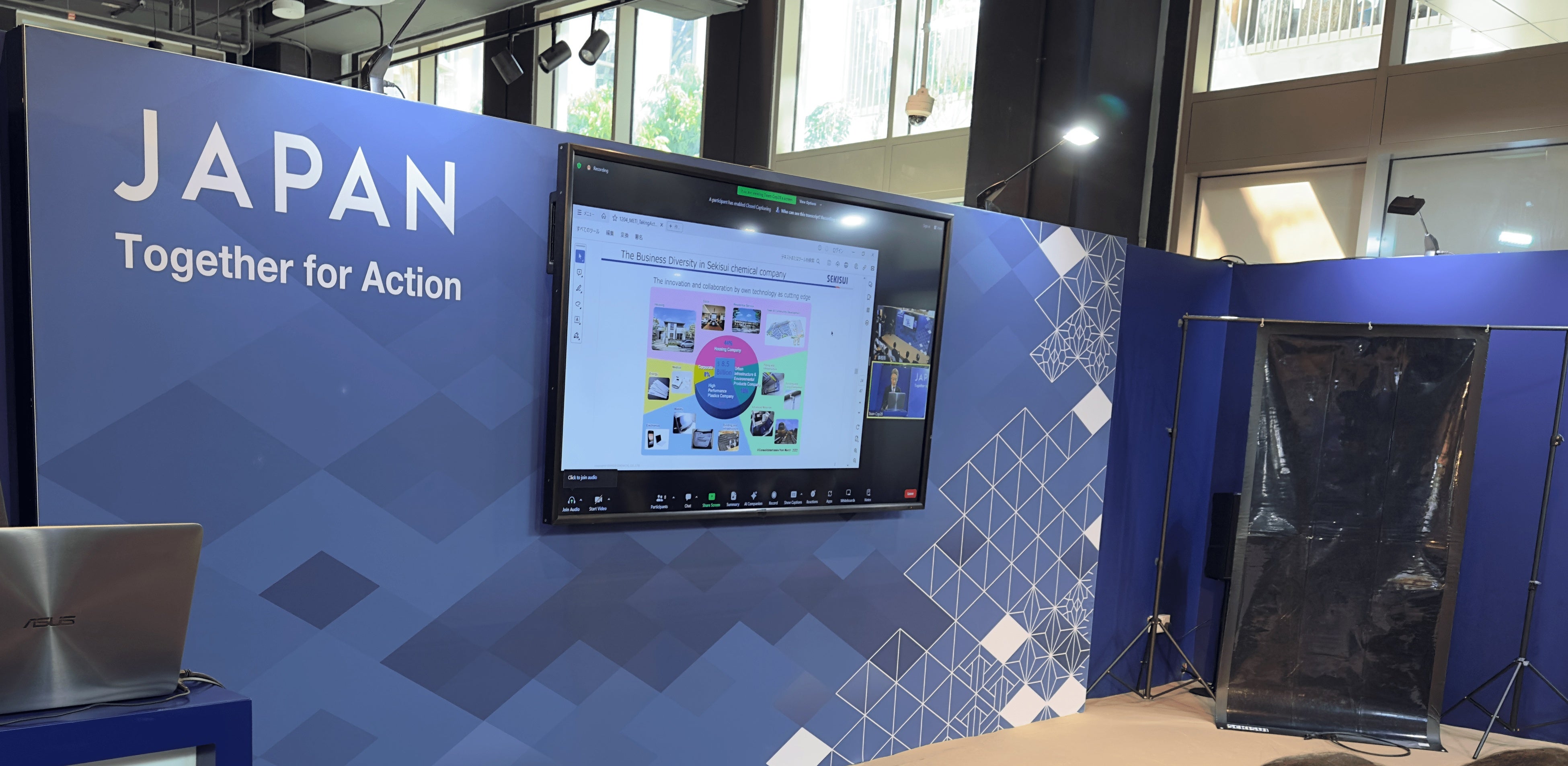 積水化学工業株式会社(代表取締役社長:加藤敬太、以下「当社」)は、12月4日にアラブ首長国連邦(ドバイ)にて開催された「COP28(国連気候変動枠組条約第28回締約国会議)」において、経済産業省主催のアジア・ゼロエミッション共同体(AZEC)構想イベント”Taking action together with ASEAN”にてフィルム型ペロブスカイト太陽電池サンプルの展示とともに、開発の概要を説明しました。
